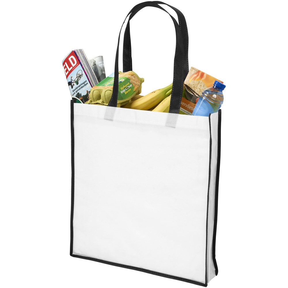 Een boodschappentas gemaakt van wit non woven PP-materiaal met gekleurde hengsels en randen. Fris... mehr