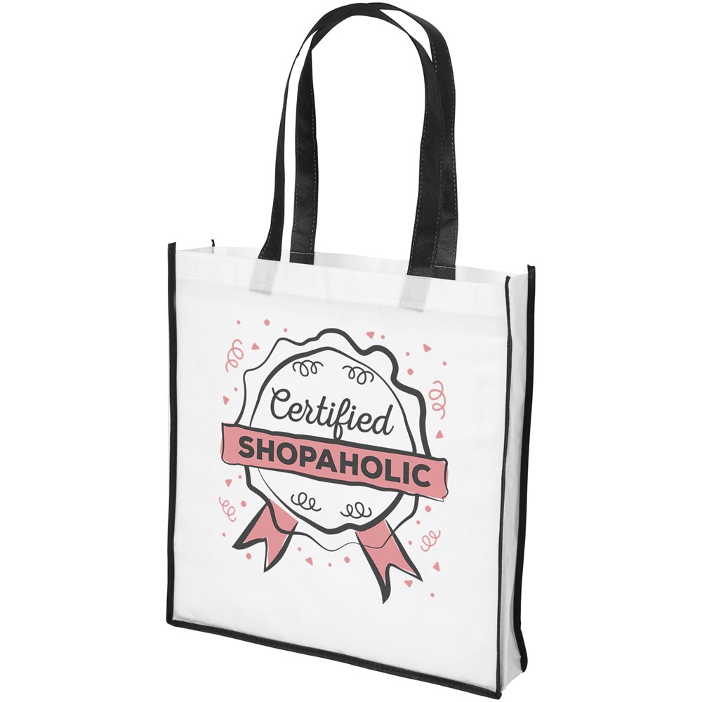 Een boodschappentas gemaakt van wit non woven PP-materiaal met gekleurde hengsels en randen. Fris en kleurrijk ontwerp. Grote versie van de Contrast Mini Shopper.