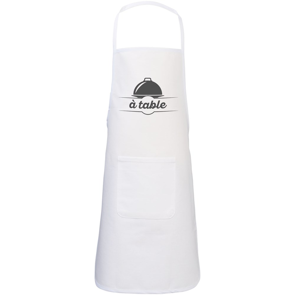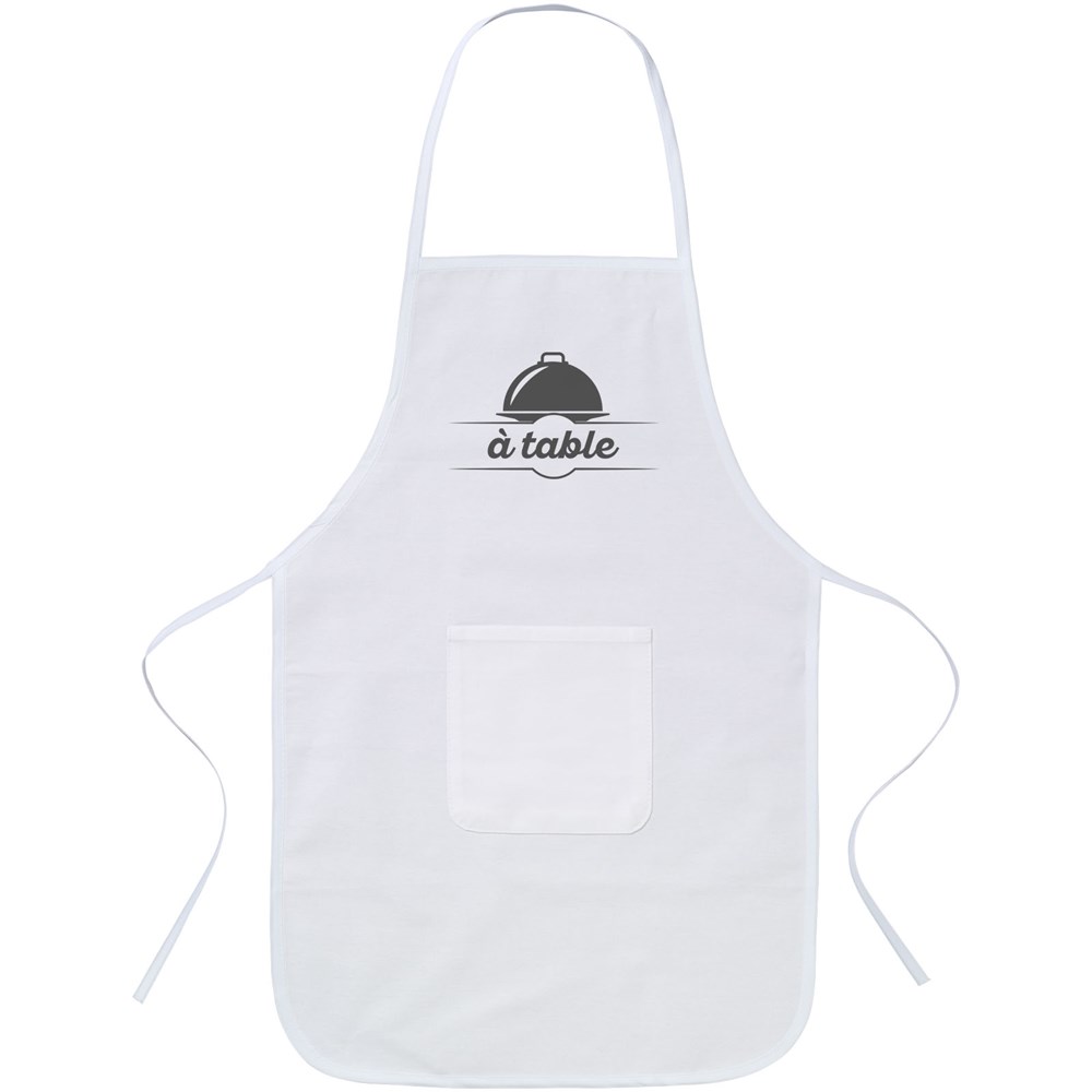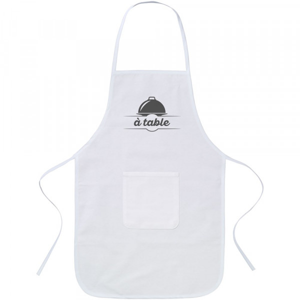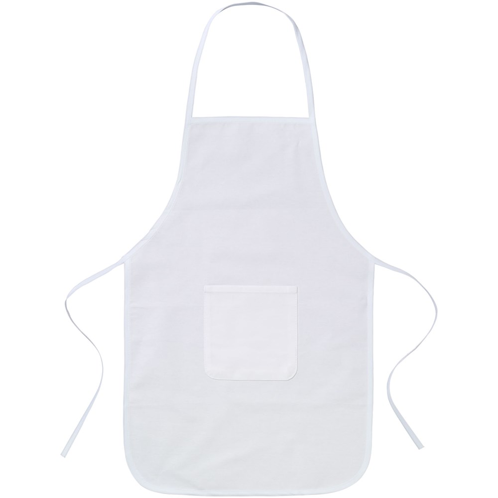 Katoenen kinderschort met voorzak en sluiting aan de achterzijde.