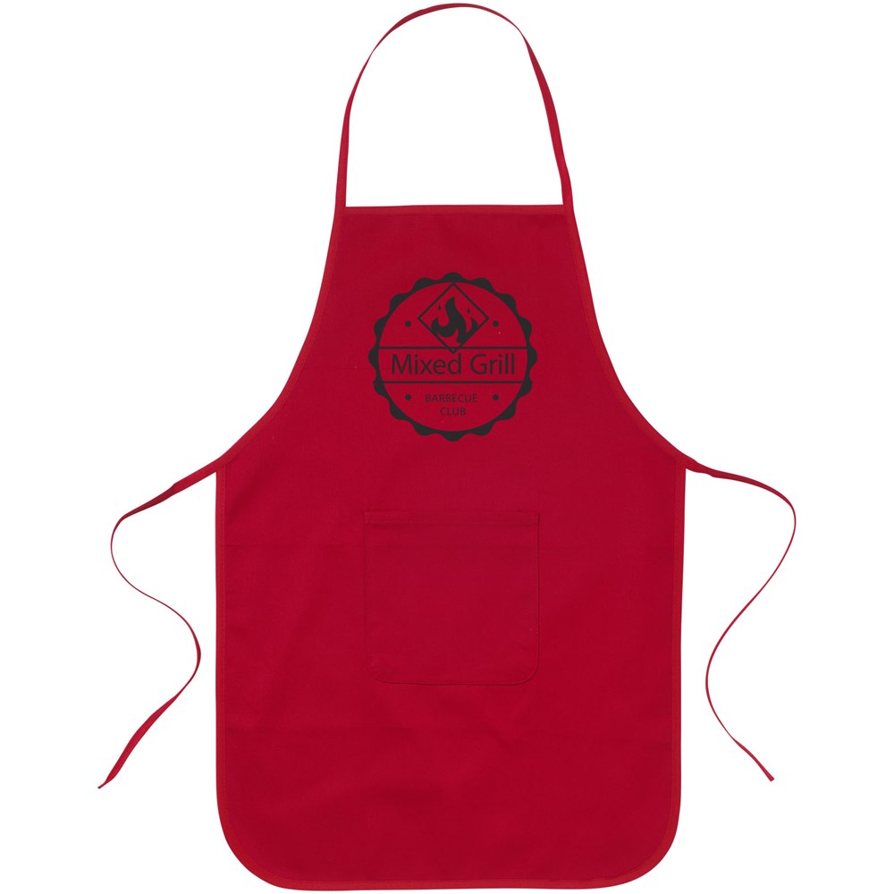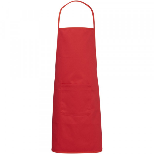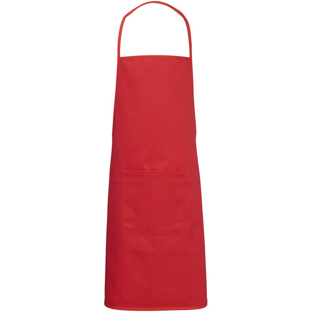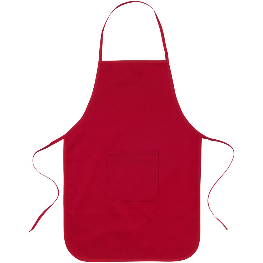 Katoenen kinderschort met voorzak en sluiting aan de achterzijde.