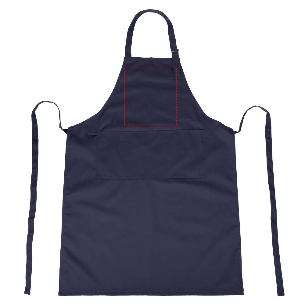 Verstelbaar schort met gesp rond de nek en sluitband. Inclusief twee zakken aan de voorkant en een handdoek lus.