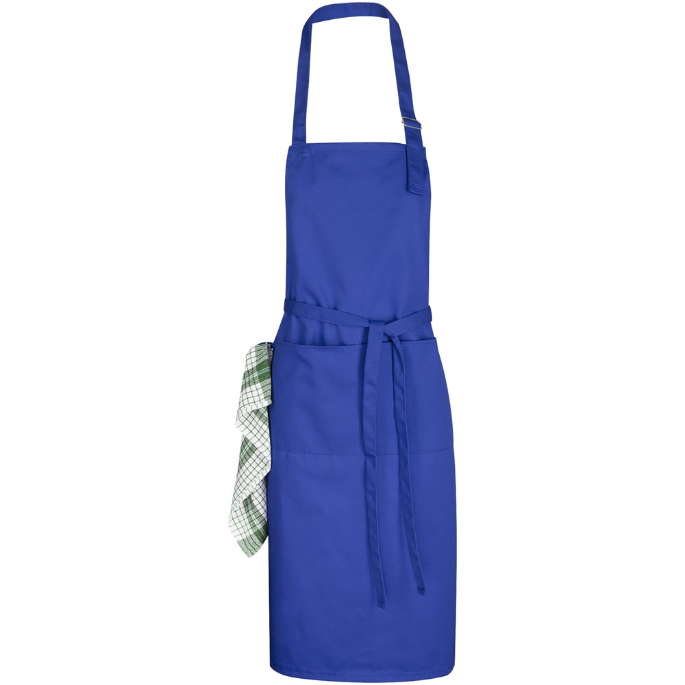 Verstelbaar schort met gesp rond de nek en sluitband. Inclusief twee zakken aan de voorkant en een handdoek lus.