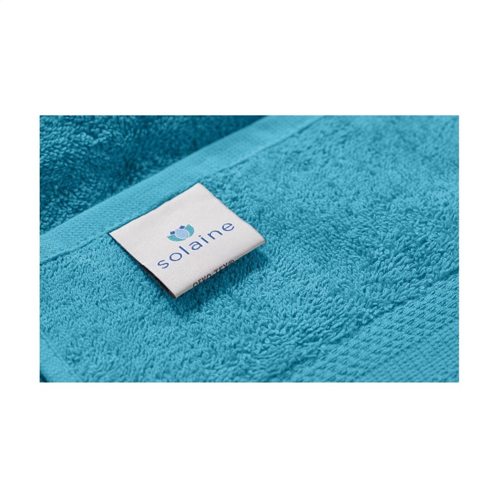 Handdoek van het merk Solaine. Zware kwaliteit badstof van 100% katoen (450 g/m²), zacht en comfortabel. Met mooi ingeweven band met fraai motief. Ter info: De mogelijkheden m.b.t. het borduren van kleine details in een logo (zoals bijvoorbeeld hele kleine letters) zijn bij borduren beperkter dan bij bedrukken. Het kan daarom voorkomen dat we je, na ontvangst van je logo, adviseren het logo te aan te passen of te vergroten.