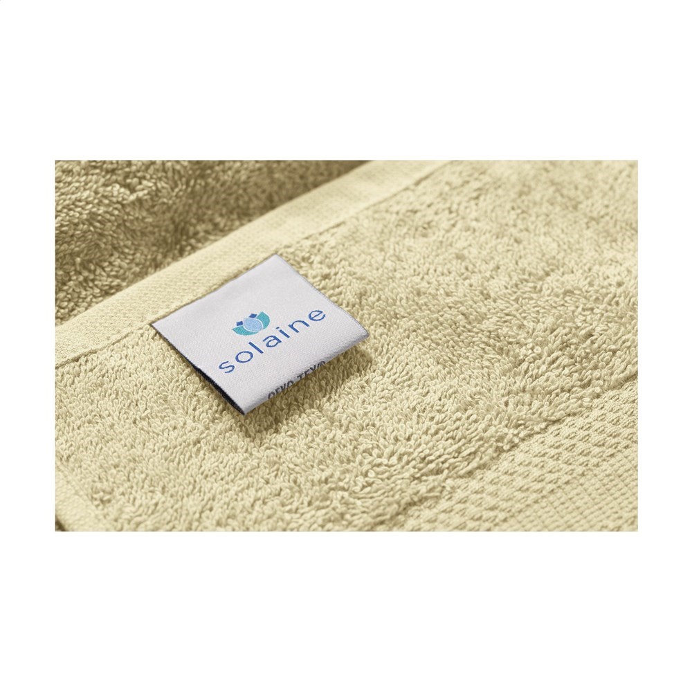 Handdoek van het merk Solaine. Zware kwaliteit badstof van 100% katoen (450 g/m²), zacht en comfortabel. Met mooi ingeweven band met fraai motief. Ter info: De mogelijkheden m.b.t. het borduren van kleine details in een logo (zoals bijvoorbeeld hele kleine letters) zijn bij borduren beperkter dan bij bedrukken. Het kan daarom voorkomen dat we je, na ontvangst van je logo, adviseren het logo te aan te passen of te vergroten.