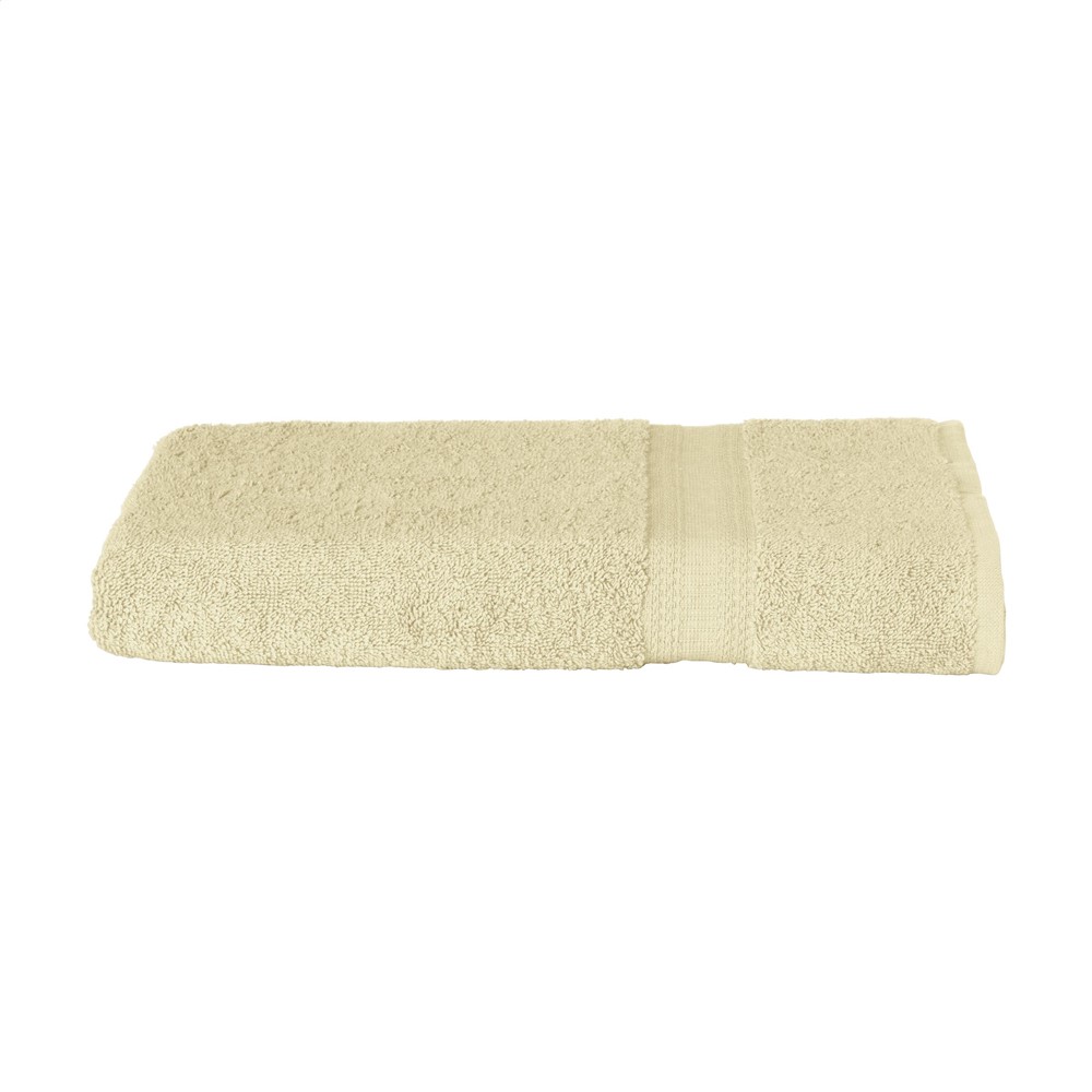 Badhanddoek van het merk Solaine. Zware kwaliteit badstof van 100% katoen (450 g/m²), zacht en comfortabel. Met mooi ingeweven band met fraai motief. Ter info: De mogelijkheden m.b.t. het borduren van kleine details in een logo (zoals bijvoorbeeld hele kleine letters) zijn bij borduren beperkter dan bij bedrukken. Het kan daarom voorkomen dat we je, na ontvangst van je logo, adviseren het logo te aan te passen of te vergroten.