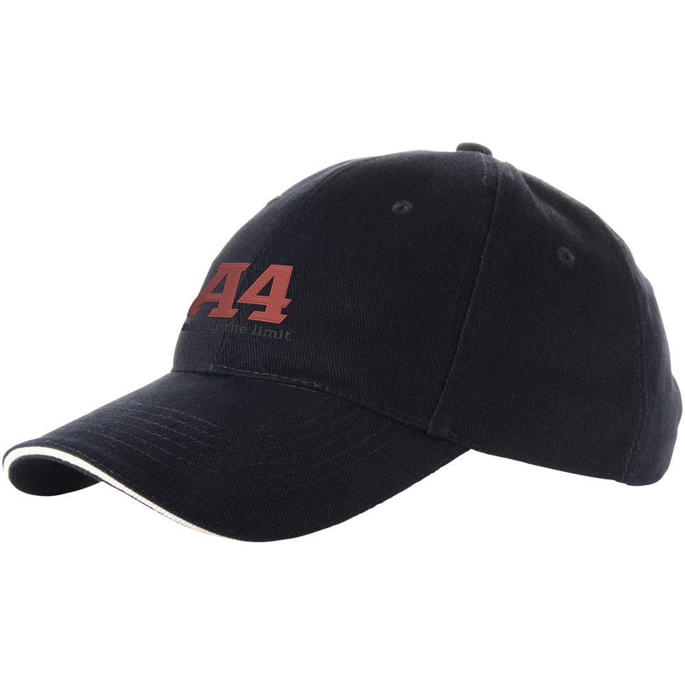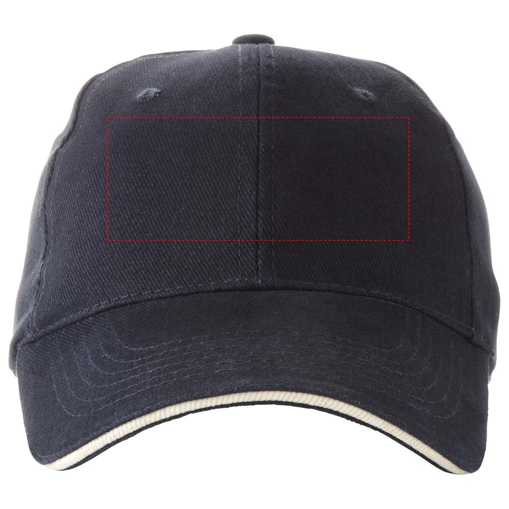 Voorgevormde klep met sandwich. Geborduurde oogjes voor ventilatie. Metalen gespsluiting.... mehr
