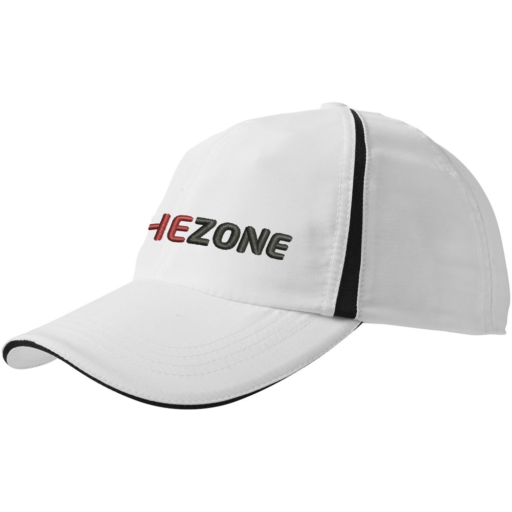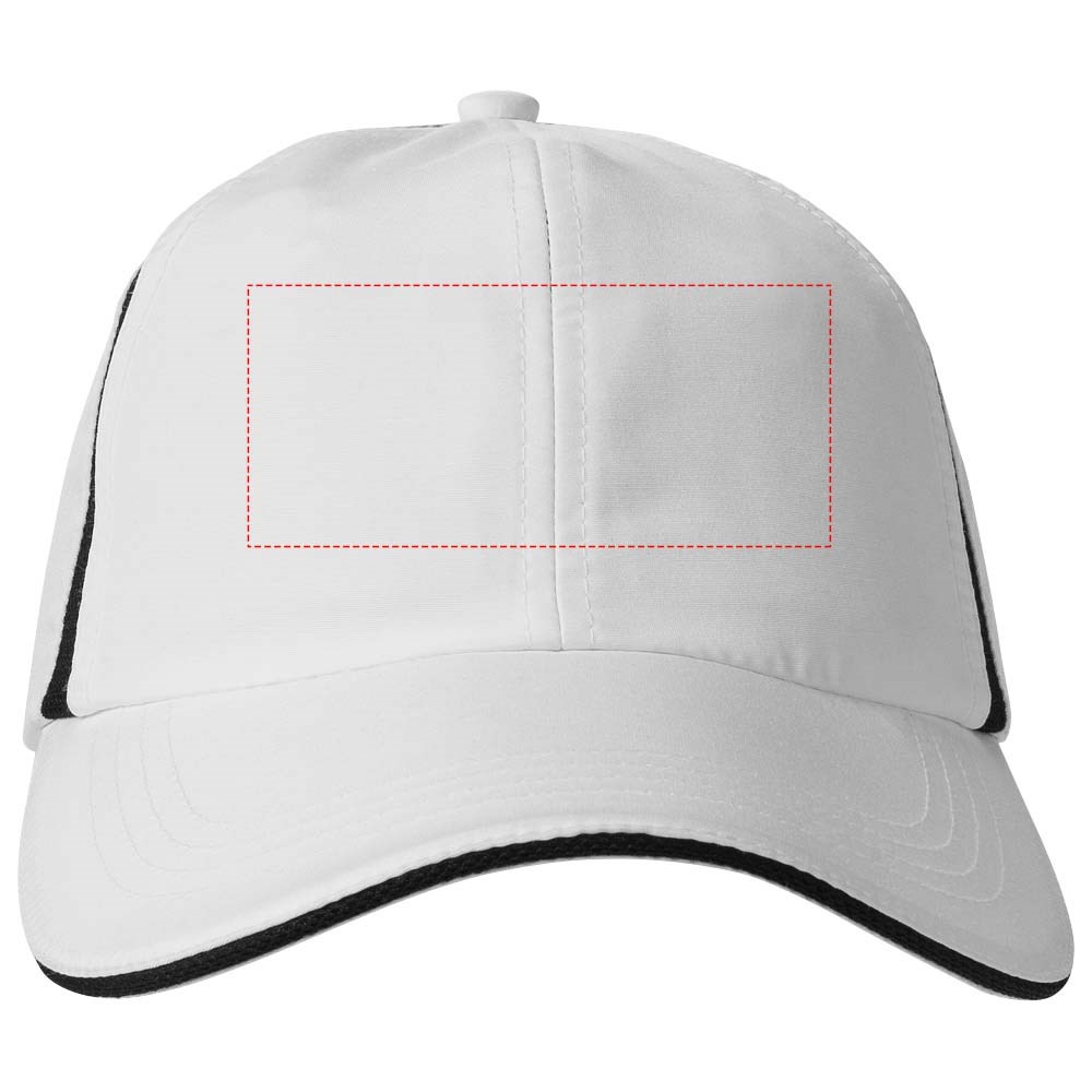 Voorgevormde klep met sandwich. Zijpanelen in mesh stof. Klittenband sluiting met rubber logoplaatje. Hoofdomtrek: 58 cm.