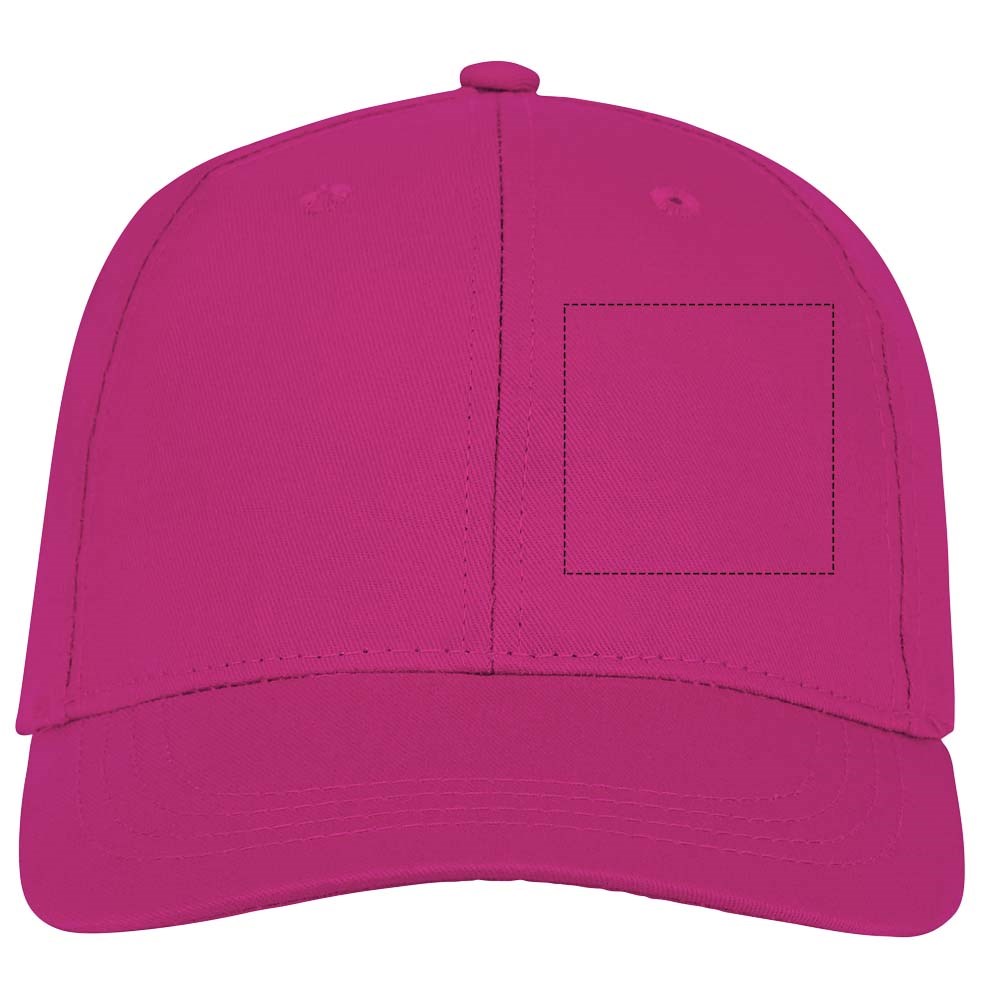 Geborduurde oogjes voor ventilatie. Klittenband sluiting. Gestructureerde voorpanels. Katoenen details aan de binnenkant. Hoofdomtrek: 58 cm.