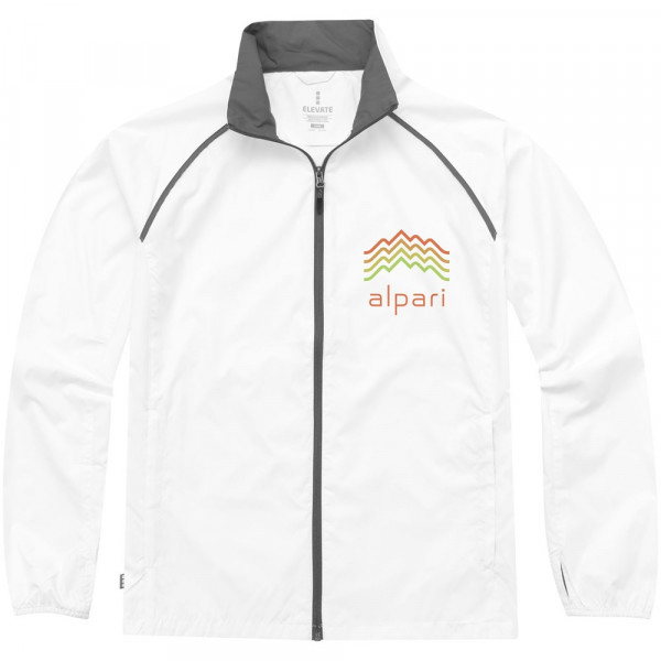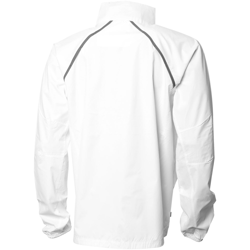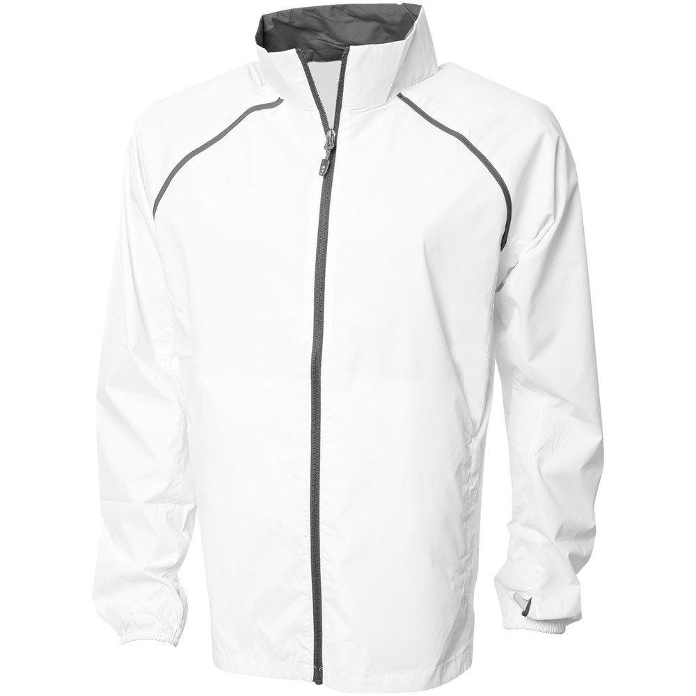 600 mm water afstotend. In de zak linksonder op te bergen. Piping details. Ventilatie aan de achterzijde. Duimsgaten. Omgekeerde spiraalritssluiting centraal vóór. Elastische manchetten. Contrasterende kleur aan binnenzijde kraag. Voorgevormde ellebogen. Steekzakken met rits.