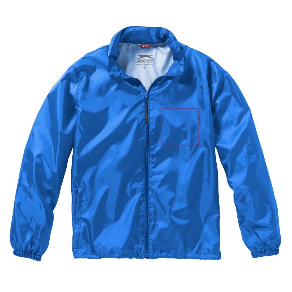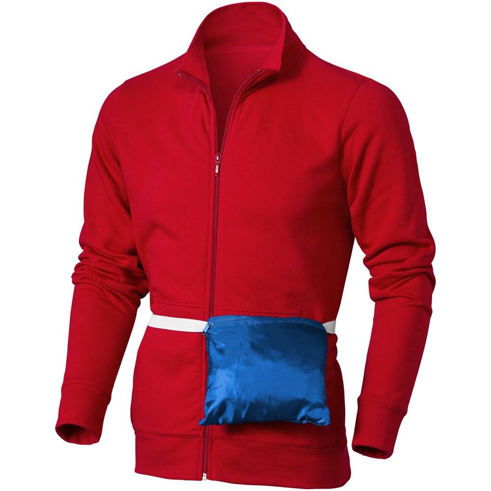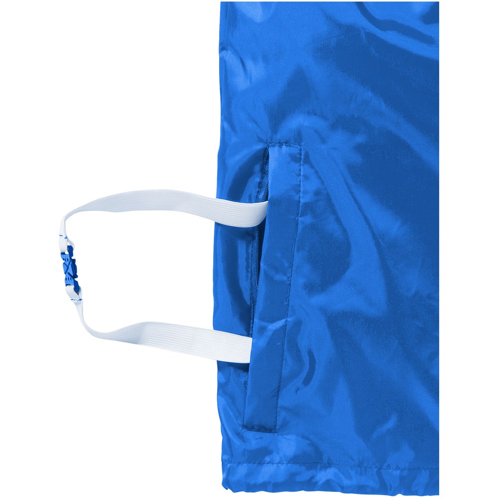 In de zak linksonder op te bergen. Rolcapuchon . Koord aan de onderzijde met koordstoppers. Zak met elastiekenband. Elastische manchetten. Transfer maatlabel voor extra comfort.