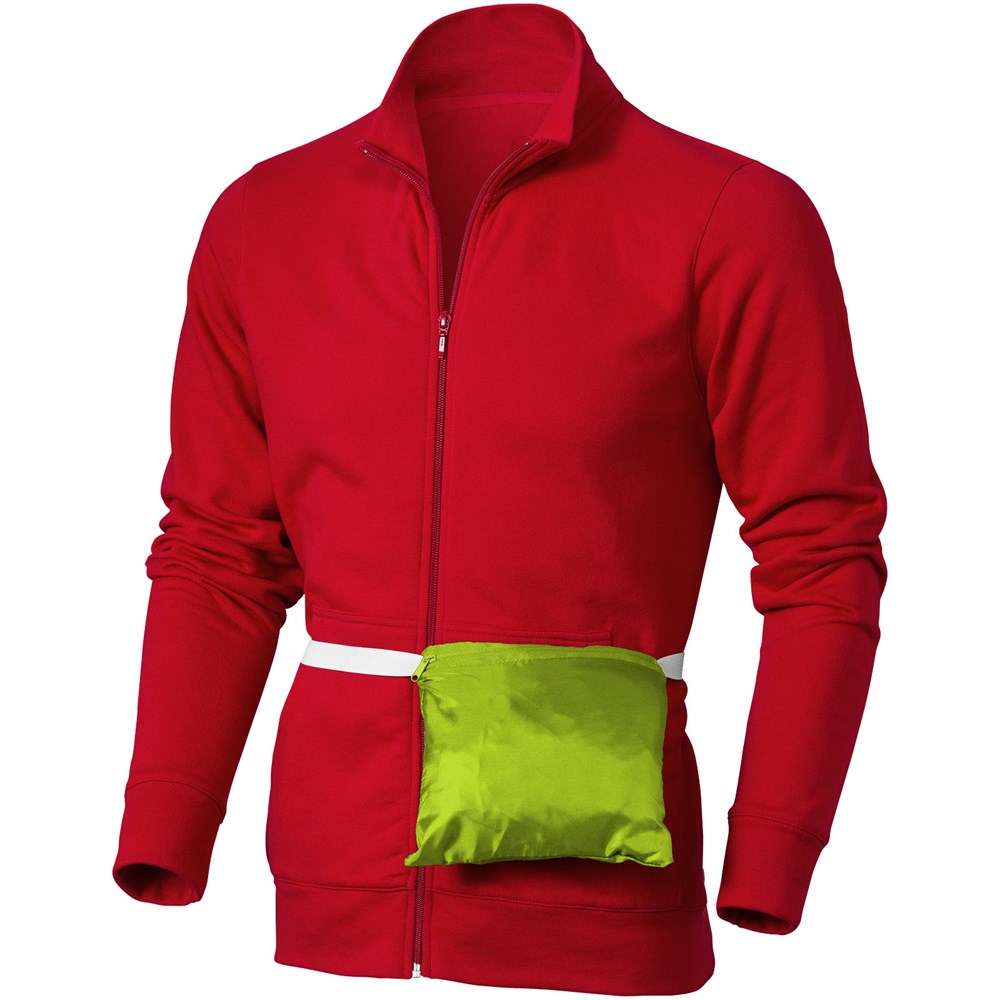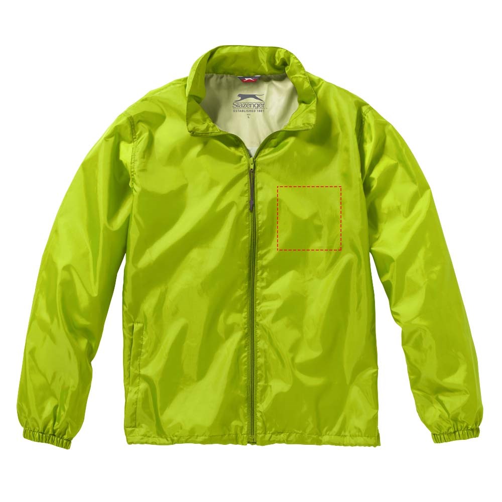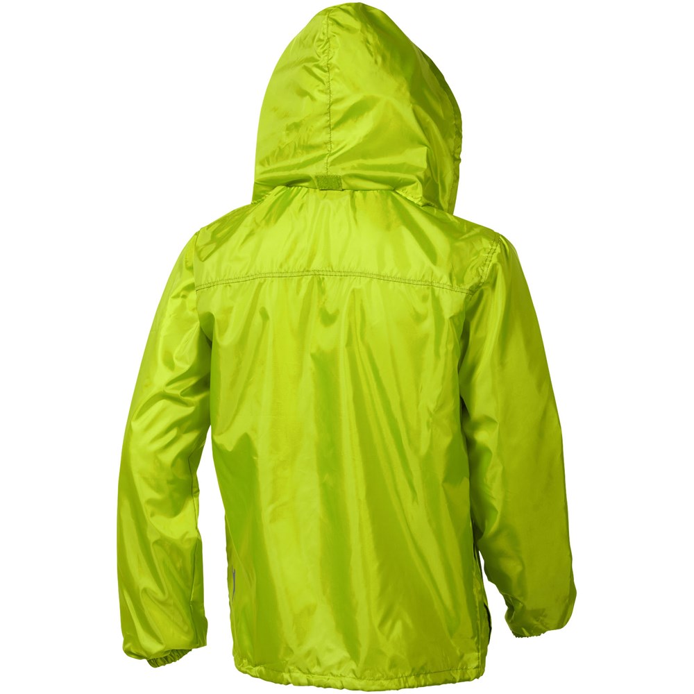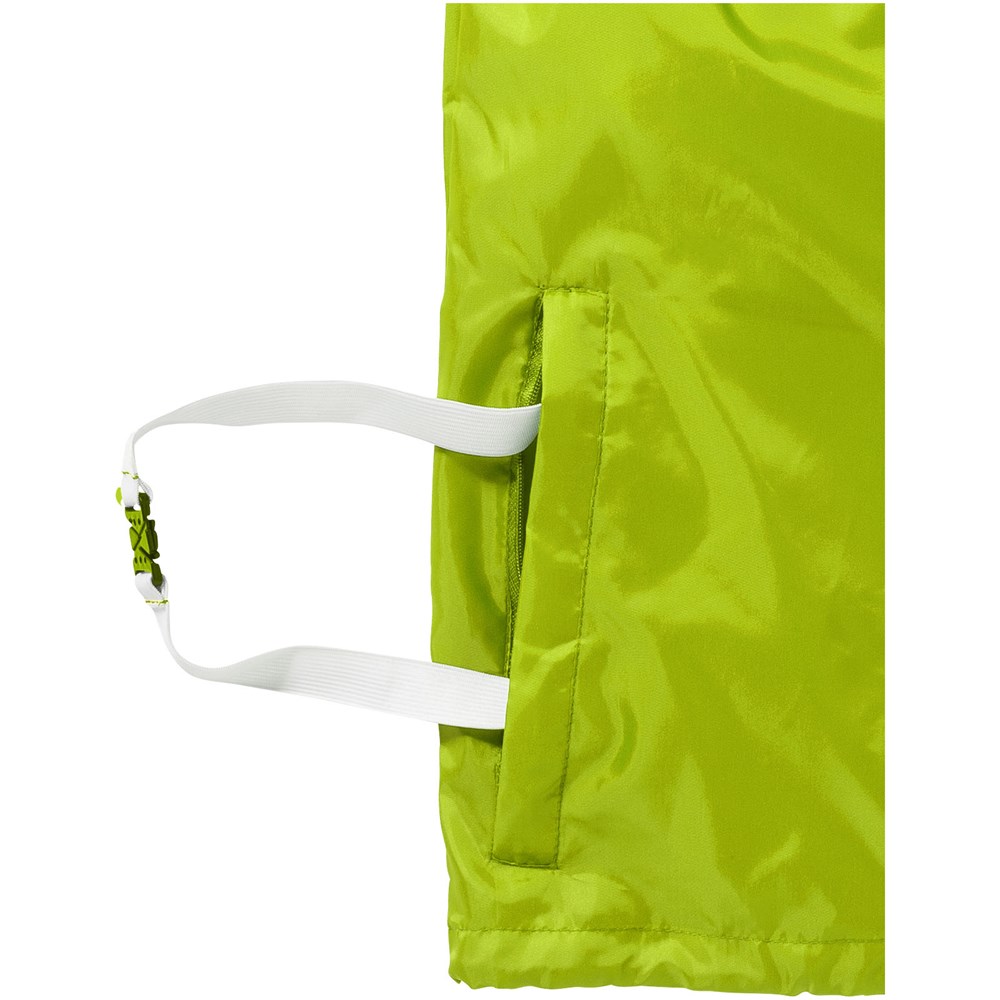 In de zak linksonder op te bergen. Rolcapuchon . Koord aan de onderzijde met koordstoppers. Zak met elastiekenband. Elastische manchetten. Transfer maatlabel voor extra comfort.