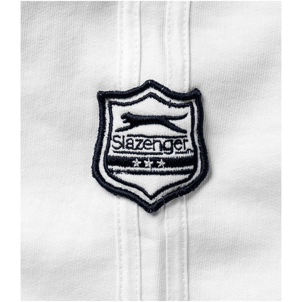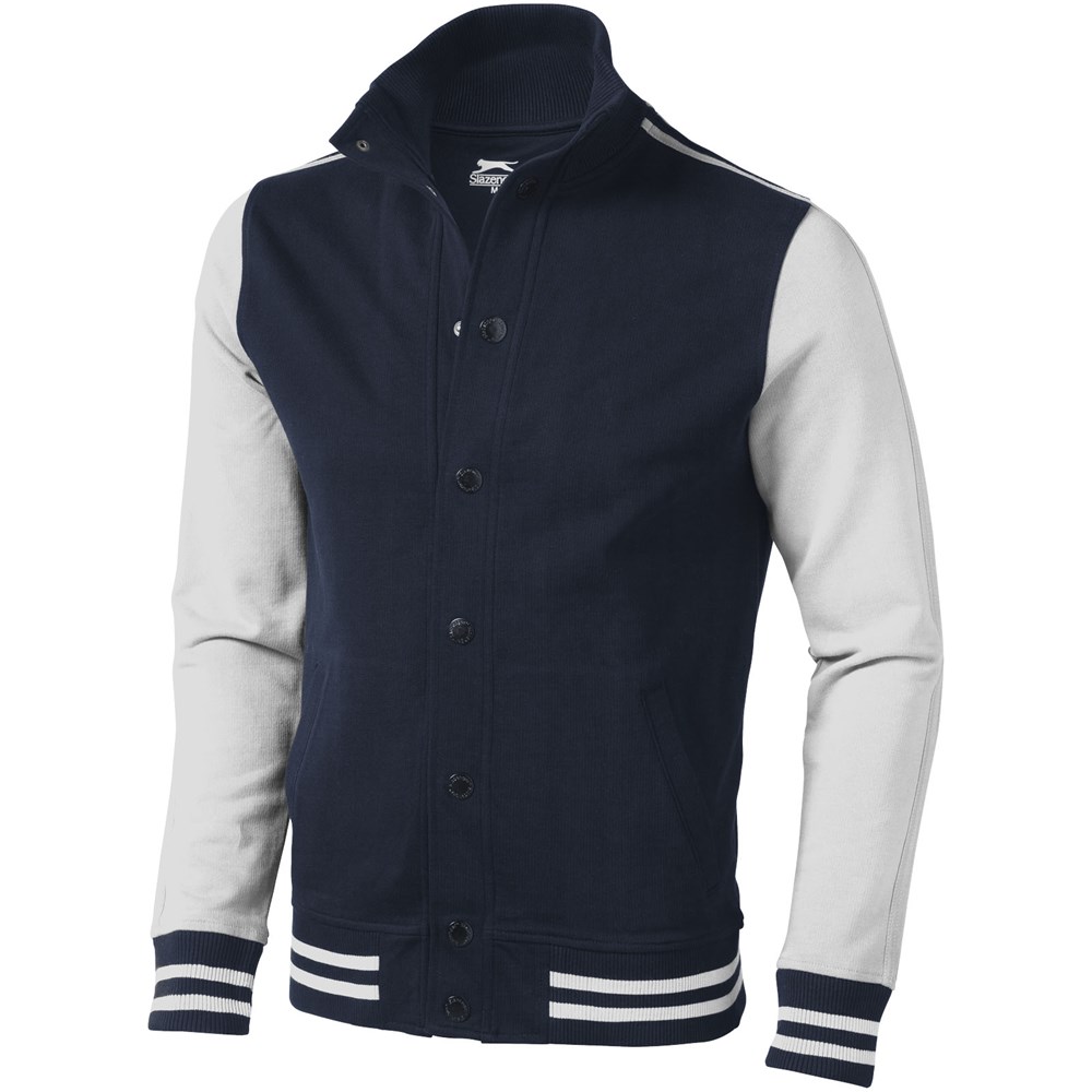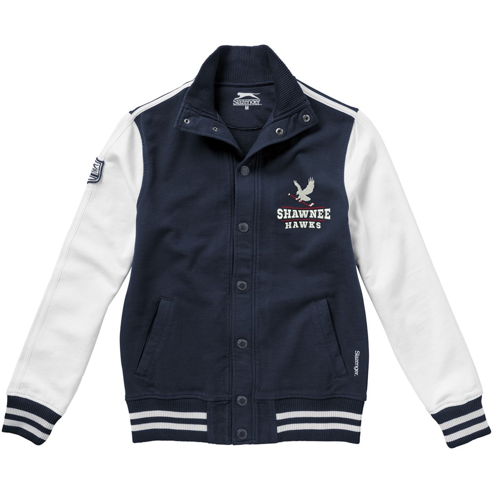 Varsity unisex college jas. Contrast gekleurde tipping op de kraag en mouwen.Steekzakken.Slazenger badge op mouw.Slazenger gemerkte drukknopen op voorsluiting.Vlakgebreide kraag.Plat gebreide rib mouw.Ribgebreide onderzijde.Transfer maatlabel voor extra comfort. French Terry van 100% katoen. 420 g/m².