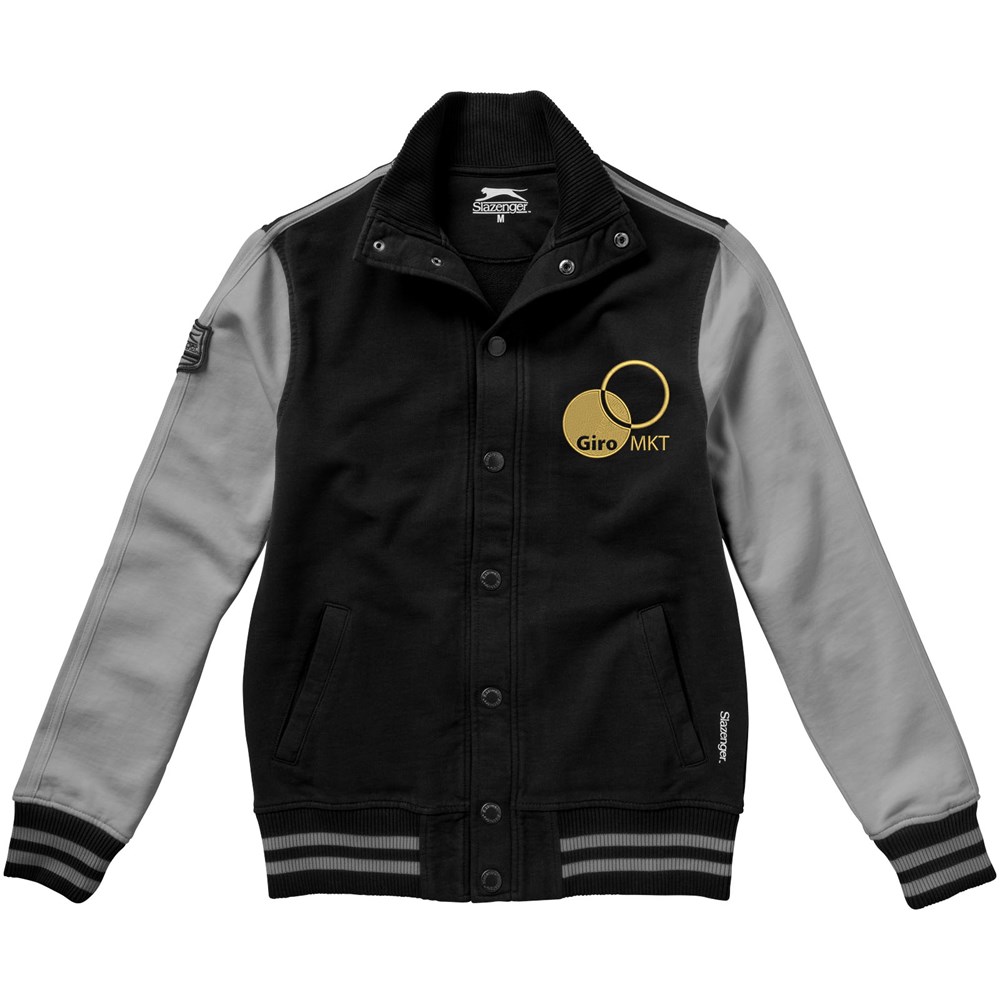 Varsity unisex college jas. Contrast gekleurde tipping op de kraag en mouwen.Steekzakken.Slazenger badge op mouw.Slazenger gemerkte drukknopen op voorsluiting.Vlakgebreide kraag.Plat gebreide rib mouw.Ribgebreide onderzijde.Transfer maatlabel voor extra comfort. French Terry van 100% katoen. 420 g/m².