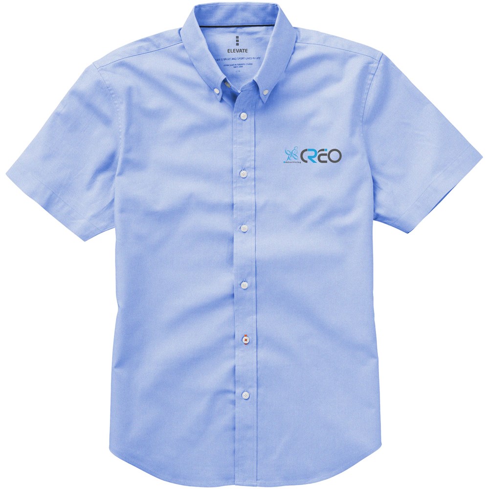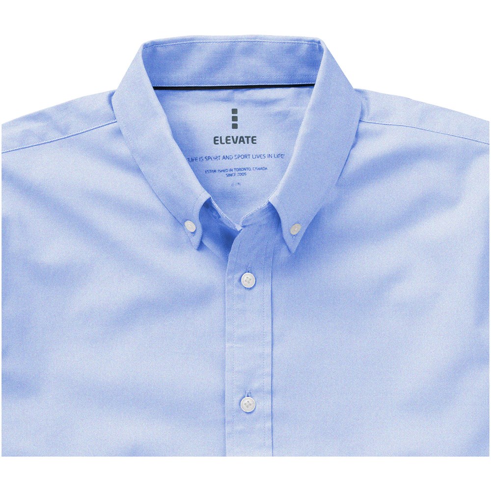 Button-down kraag. Tweede knoopsgat van onder met oranje stiksels.. Satijnen bies aan de binnenkant van de nek. Gegraveerde parel knopen. Transfer maatlabel voor extra comfort.