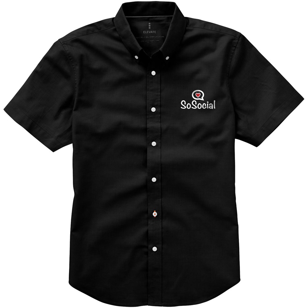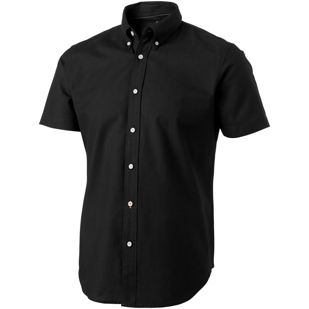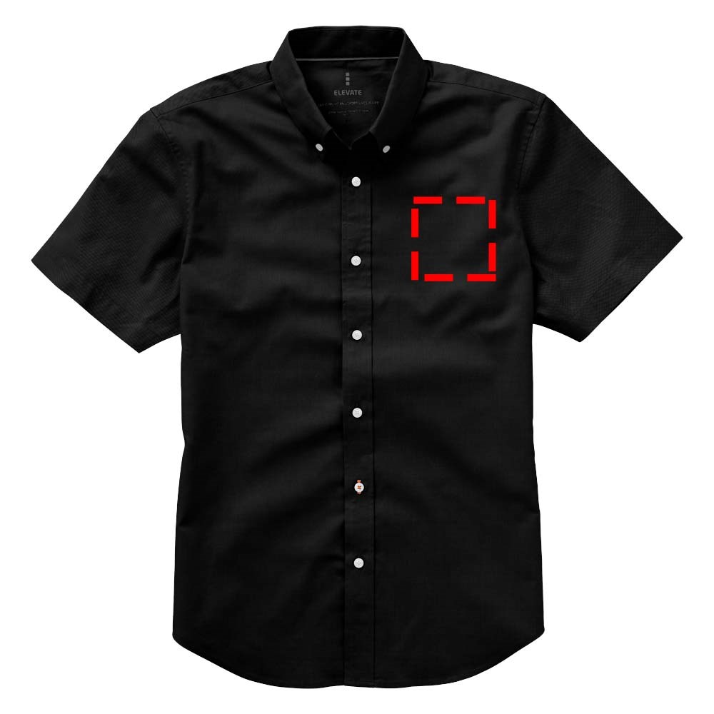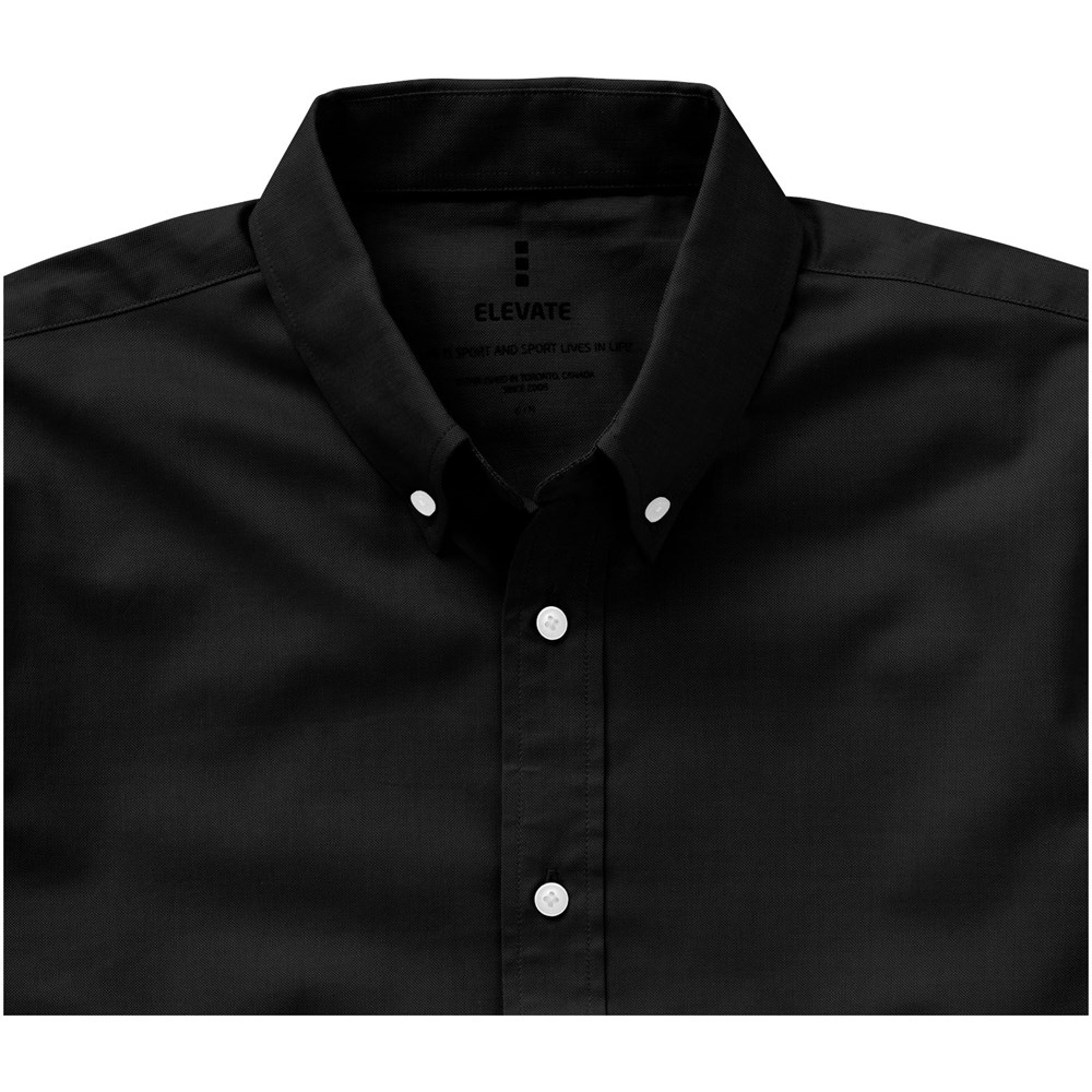 Button-down kraag. Tweede knoopsgat van onder met oranje stiksels.. Satijnen bies aan de binnenkant van de nek. Gegraveerde parel knopen. Transfer maatlabel voor extra comfort.