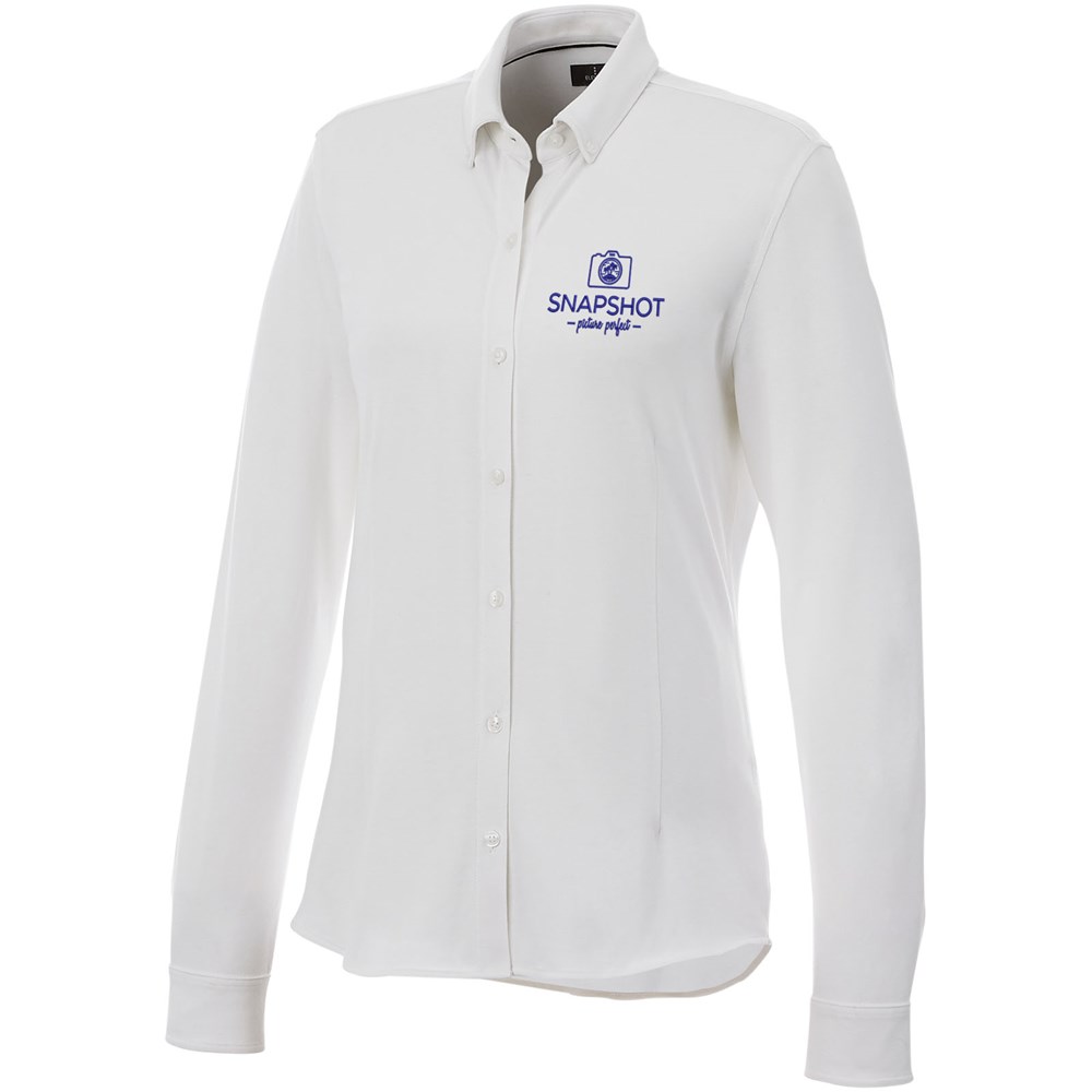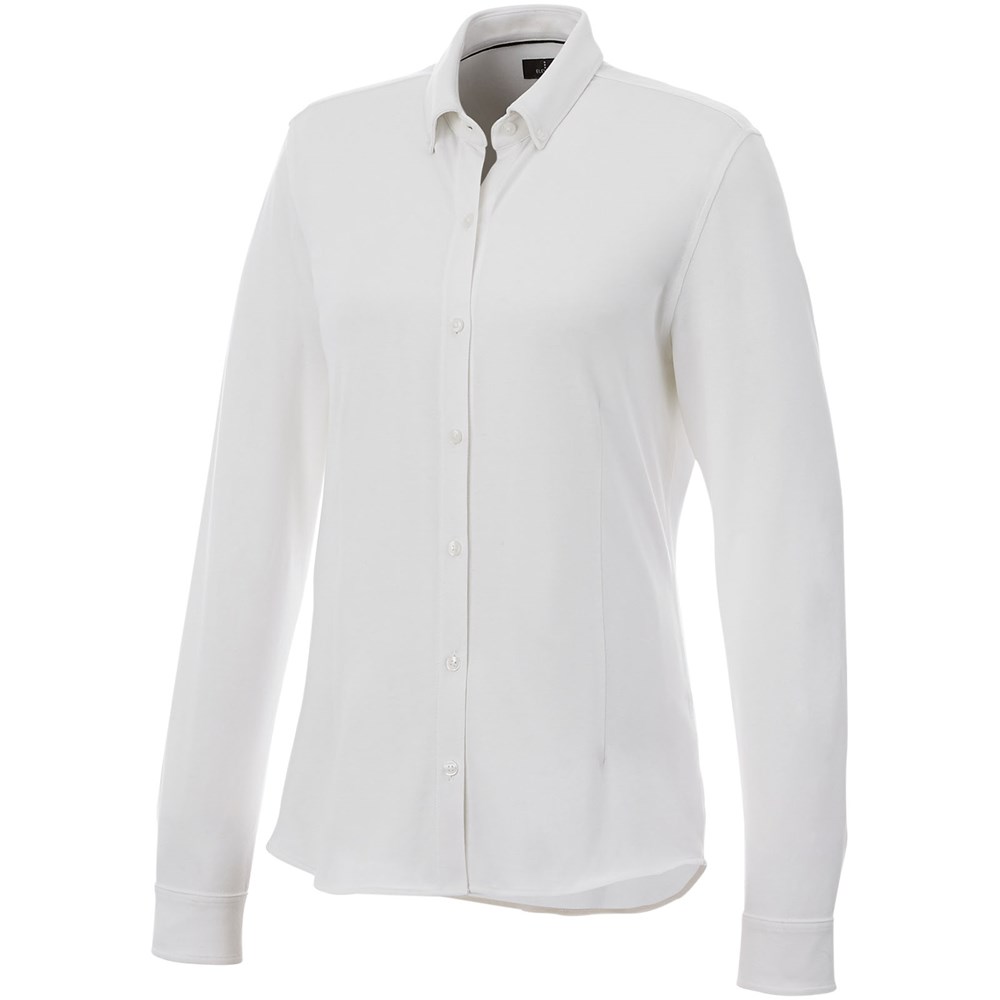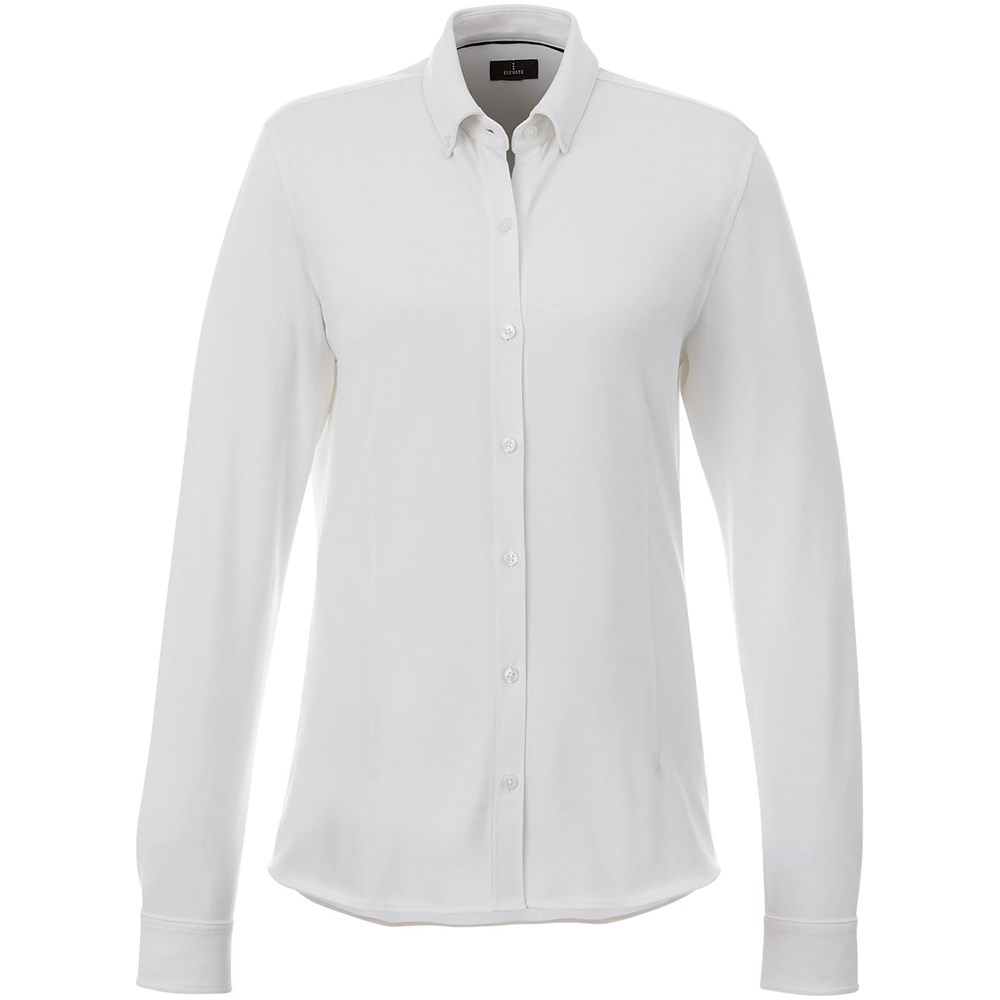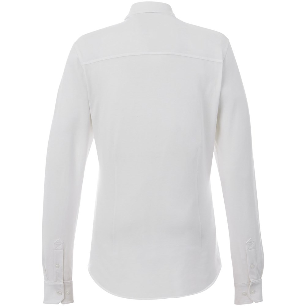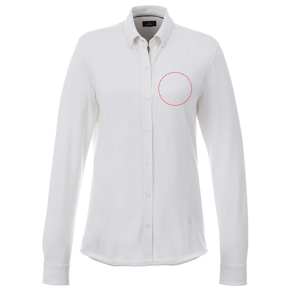 Boord in dezelfde stof. Stretch stof. Verstelbare éénknoops, éénploois manchet. Button-down kraag. Gevormde naden en flatteus getailleerde pasvorm. Satijnen bies aan de binnenkant van de nek. Gegraveerde knopen. Geweven label.