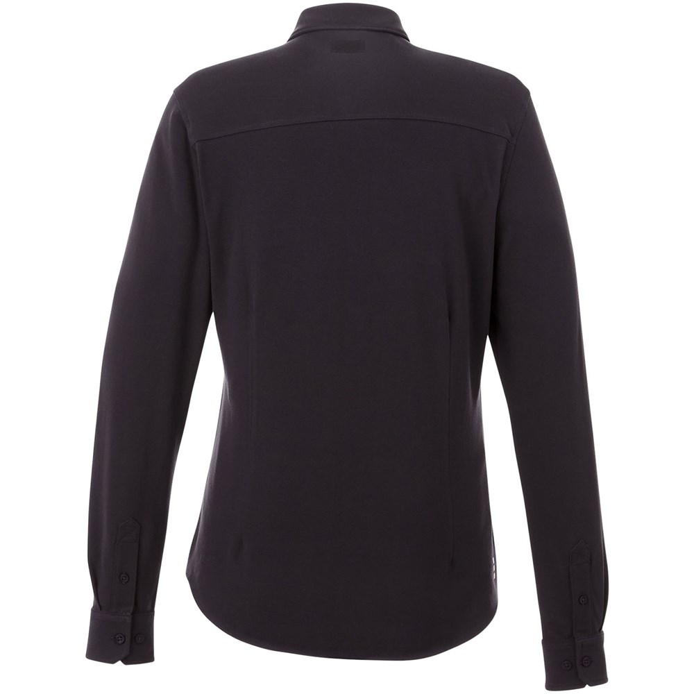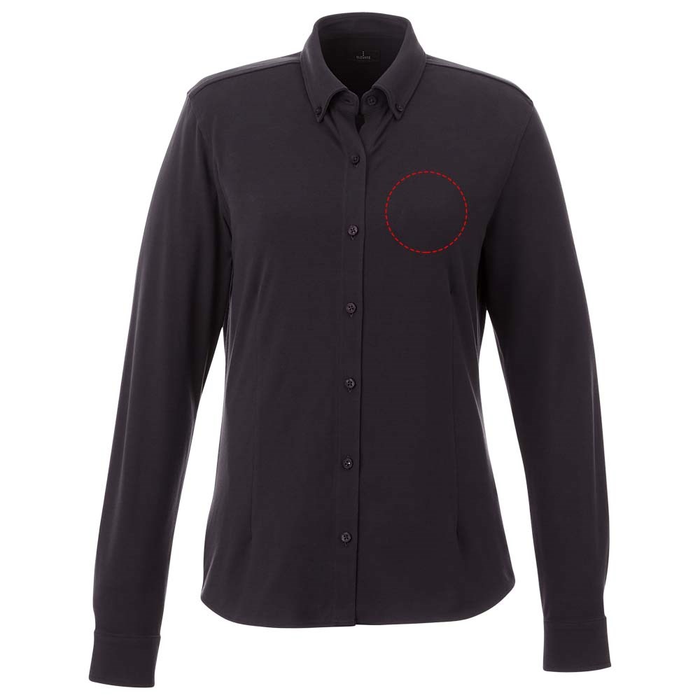 Boord in dezelfde stof. Stretch stof. Verstelbare éénknoops, éénploois manchet. Button-down kraag. Gevormde naden en flatteus getailleerde pasvorm. Satijnen bies aan de binnenkant van de nek. Gegraveerde knopen. Geweven label.