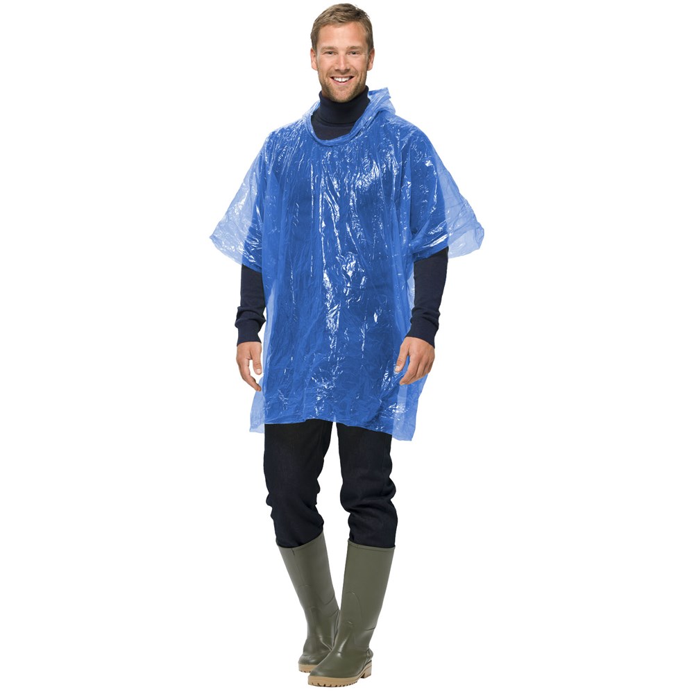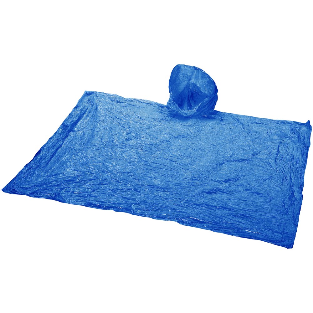 Poncho met capuchon voor de onverwachte stortbui: One-size-fits-all. Verpakt in een handig compact tasje dat in elke zak of tas past en zelfs aan een sleutelring te haken is. Bedrukking is alleen mogelijk op het tasje.