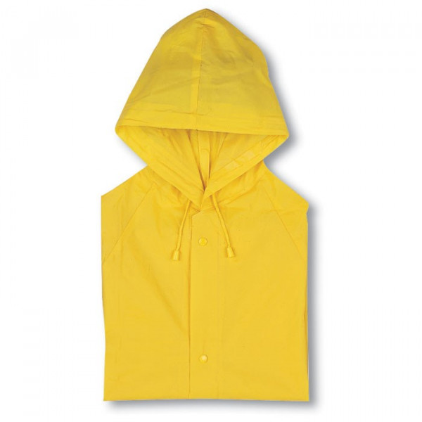 Regenjas PVC met capuchon en drukknoopsluiting.