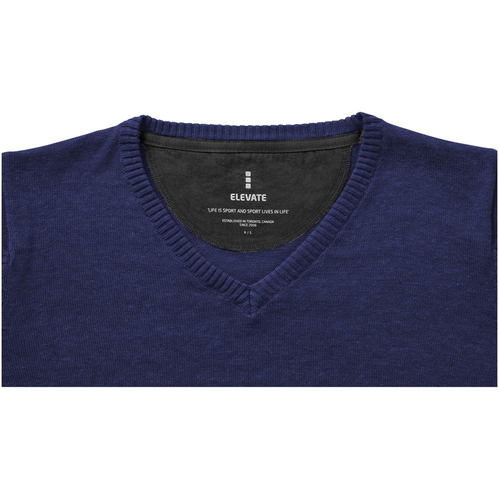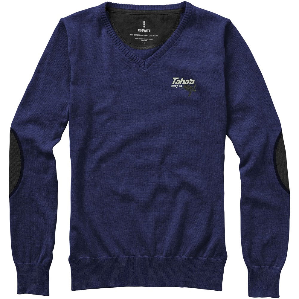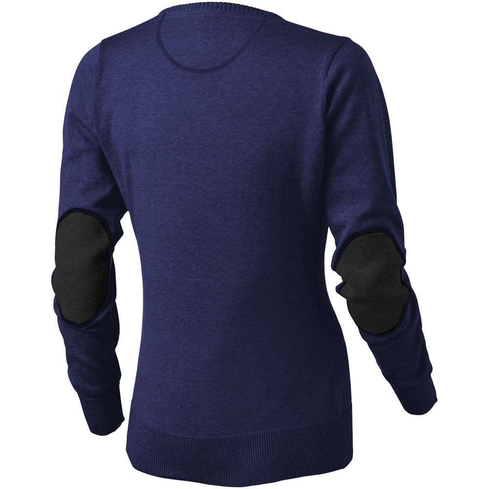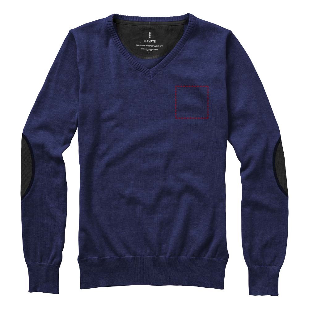 V-hals. Twill elleboogstukken in contrasterende kleur. Toelopende taille voor een meer flatterende pasvorm. Vlakgebreide kraag. Plat gebreide rib mouw. Ribgebreide onderzijde. Contrast gekleurde halve maan. Satijnen nektape. Transfer maatlabel voor extra comfort.