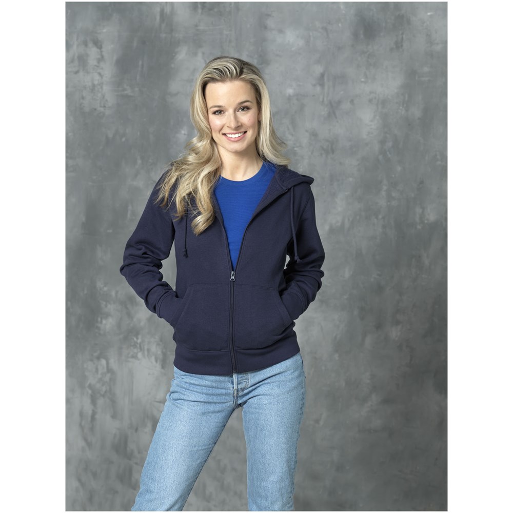 Opties voor gepersonaliseerde bewerking. Uitneembaar label voor draagcomfort. Trekkoord in capuchon. Vrijliggende ritssluiting centraal vóór, met contrastband. Kangoeroezak. Vlakgebreide geribde onderzijde en vlakgebreide ribmouwen. Geborsteld aan de binnenkant. Nektape in dezelfde stof. Gevormde naden en flatteus getailleerde pasvorm.