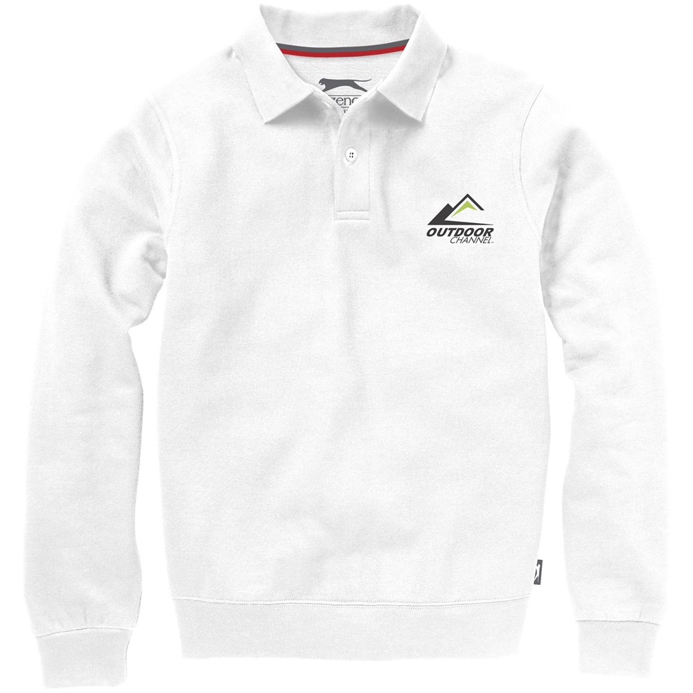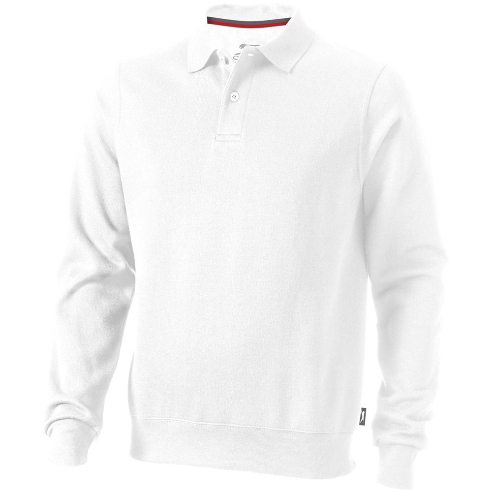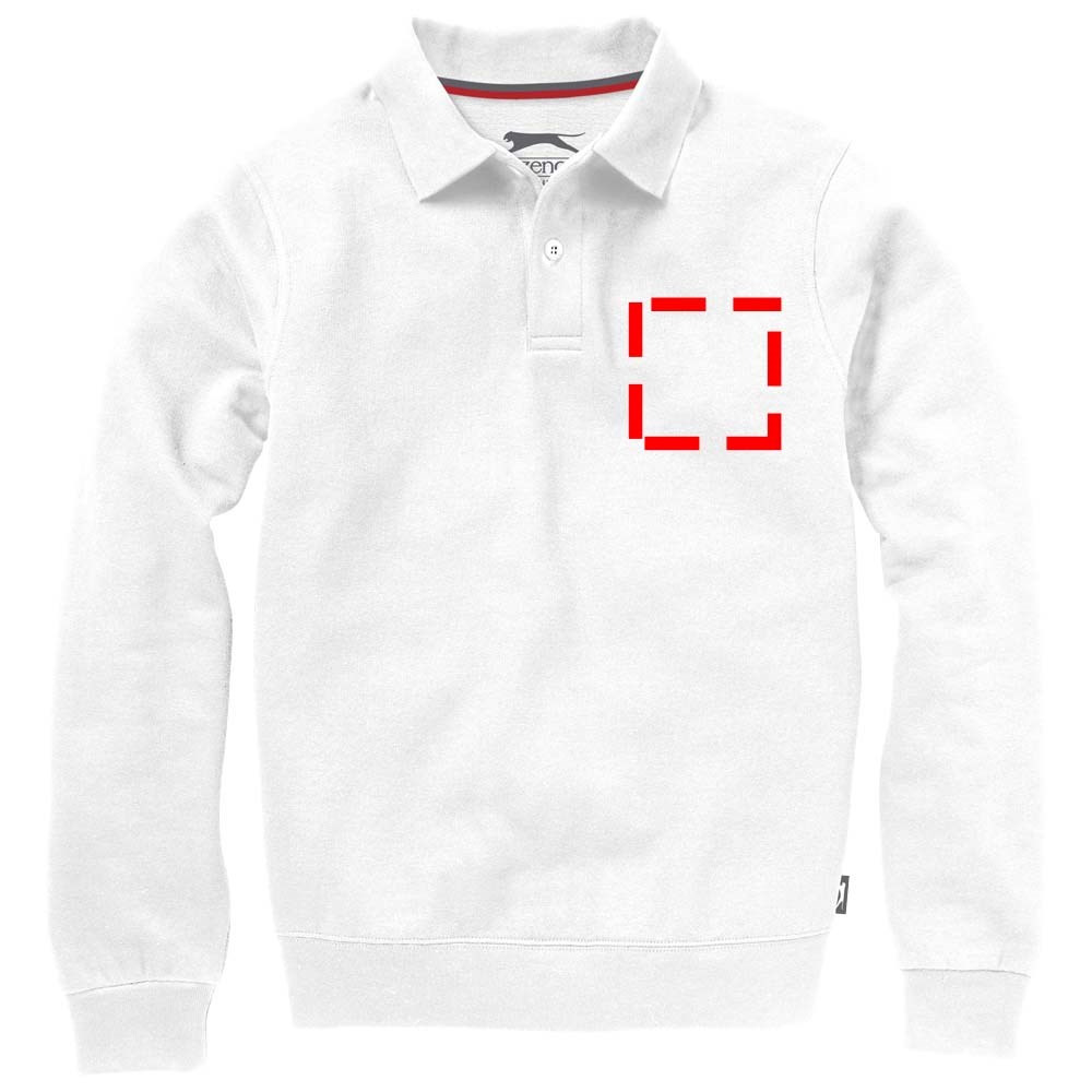 knopenlijst met twee knopen. Vlakgebreide kraag. Plat gebreide rib mouw. Ribgebreide onderzijde. Halve maan. Twee kleuren nektape. Gegraveerde knopen. Label in zijnaad. Transfer maatlabel voor extra comfort.