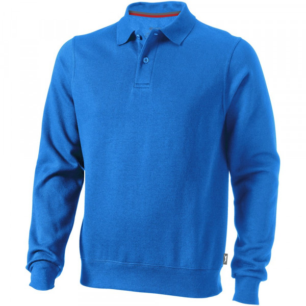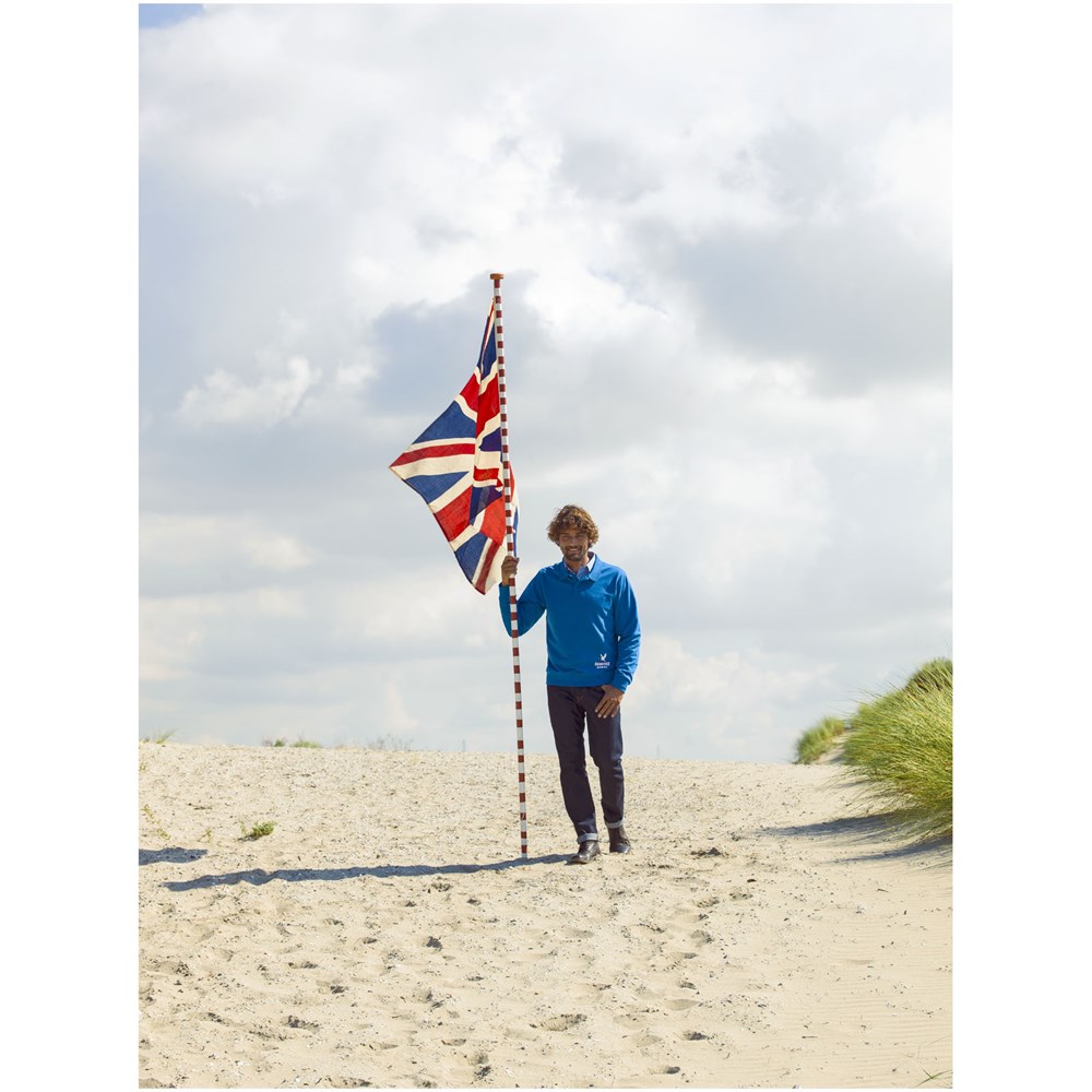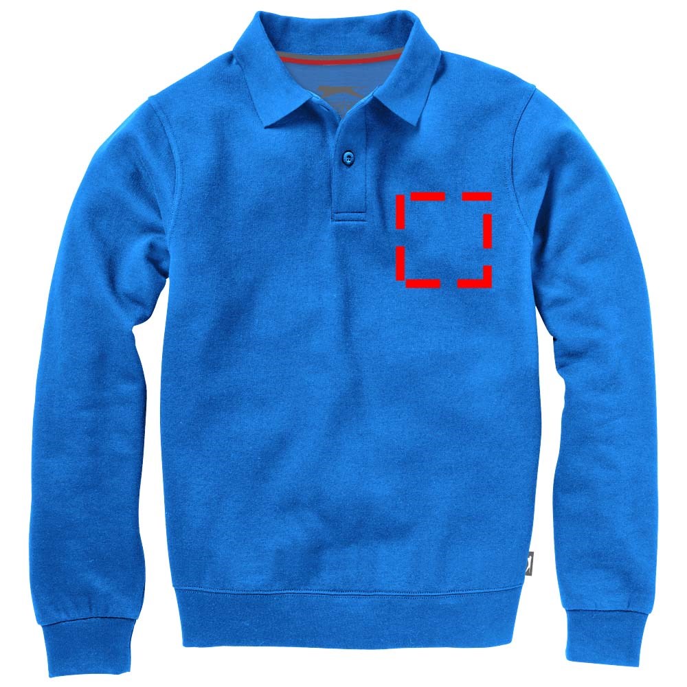 knopenlijst met twee knopen. Vlakgebreide kraag. Plat gebreide rib mouw. Ribgebreide onderzijde. Halve maan. Twee kleuren nektape. Gegraveerde knopen. Label in zijnaad. Transfer maatlabel voor extra comfort.