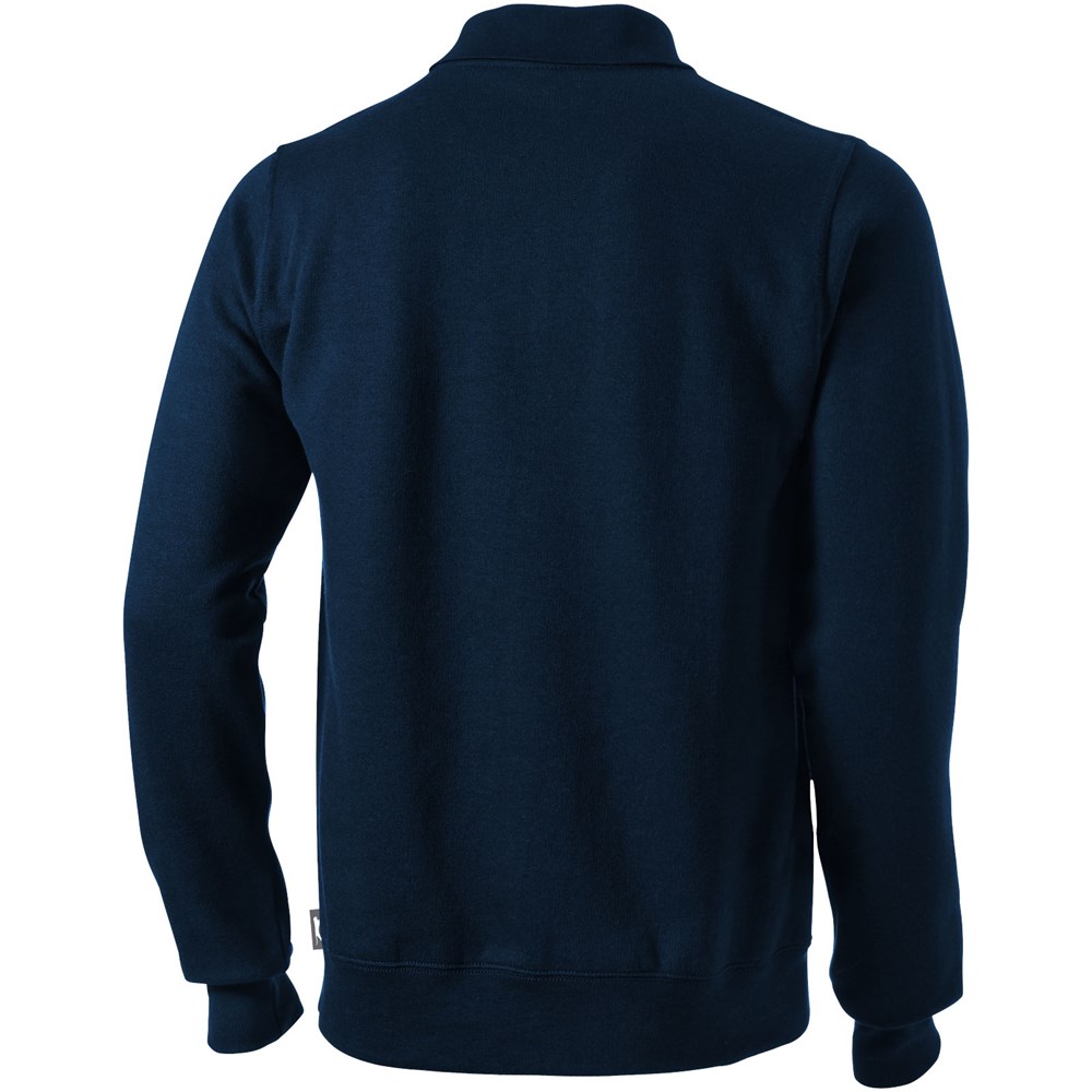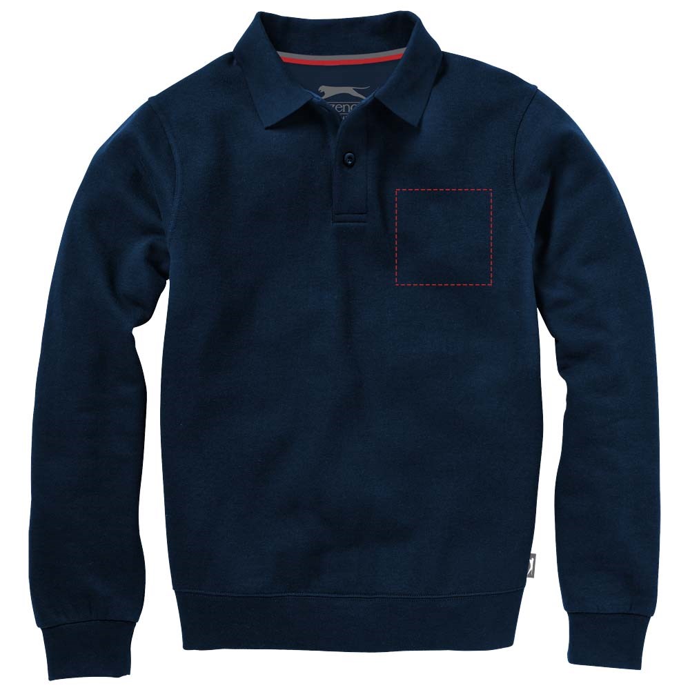 knopenlijst met twee knopen. Vlakgebreide kraag. Plat gebreide rib mouw. Ribgebreide onderzijde. Halve maan. Twee kleuren nektape. Gegraveerde knopen. Label in zijnaad. Transfer maatlabel voor extra comfort.