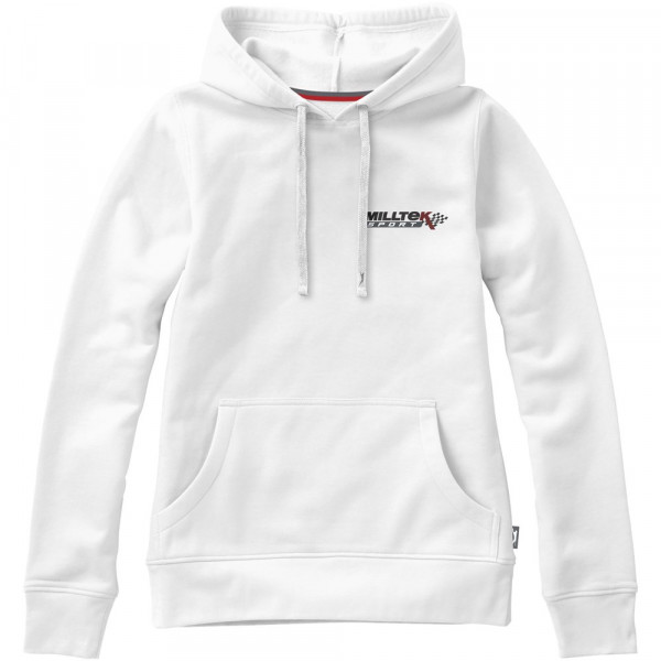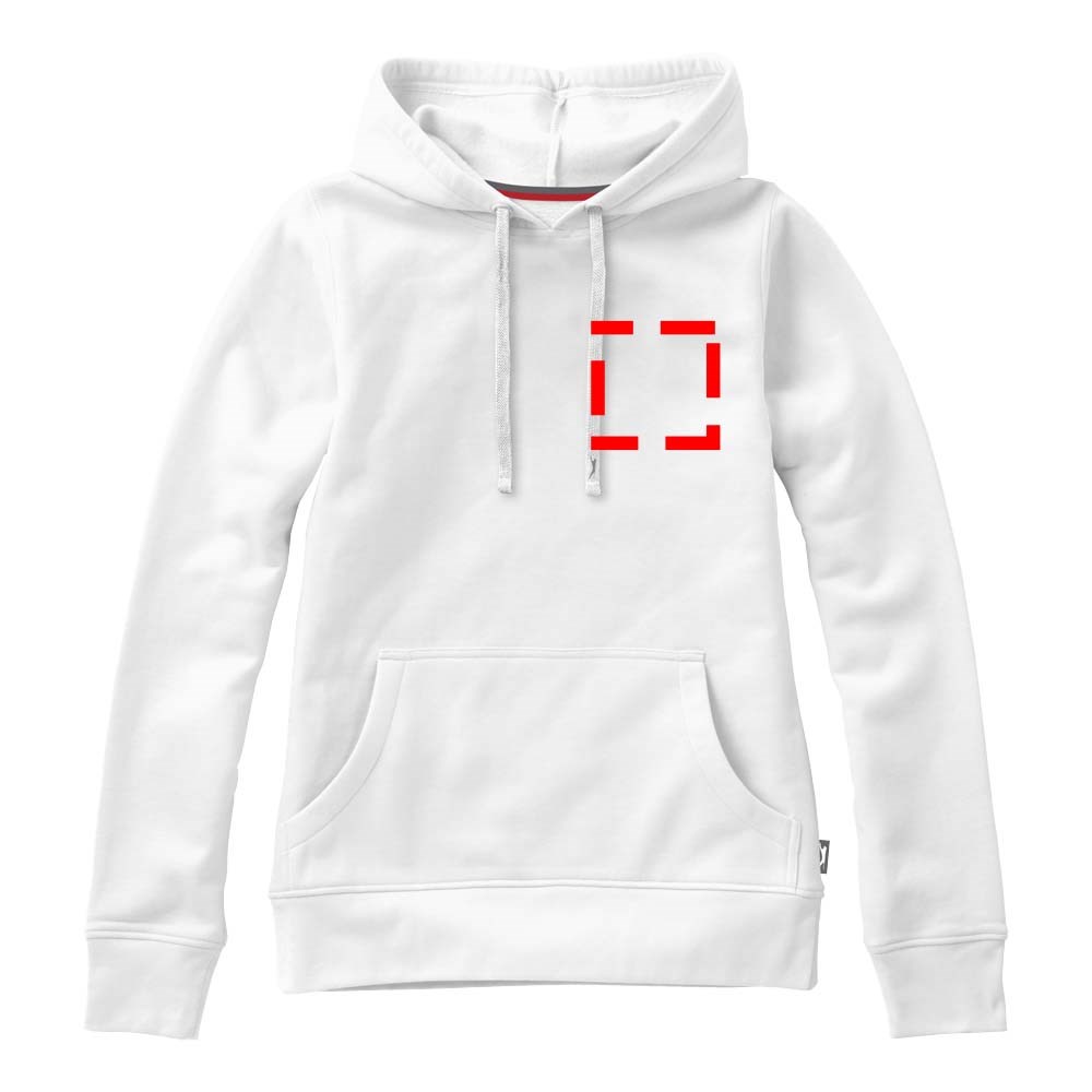 Plat gebreide rib mouw. Ribgebreide onderzijde. Trekkoord in capuchon. Kangoeroezak. Halve maan. Twee kleuren nektape. Gegraveerde zilveren oogjes. Label in zijnaad. Transfer maatlabel voor extra comfort.