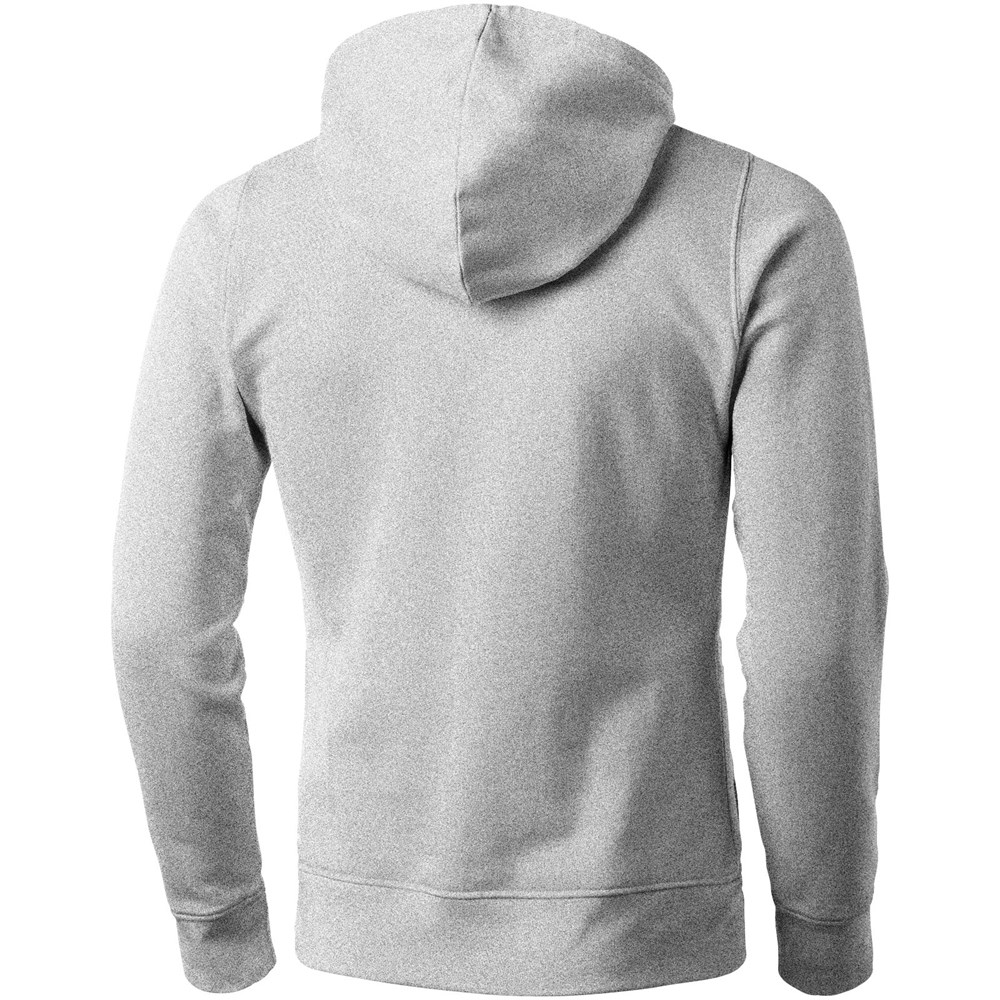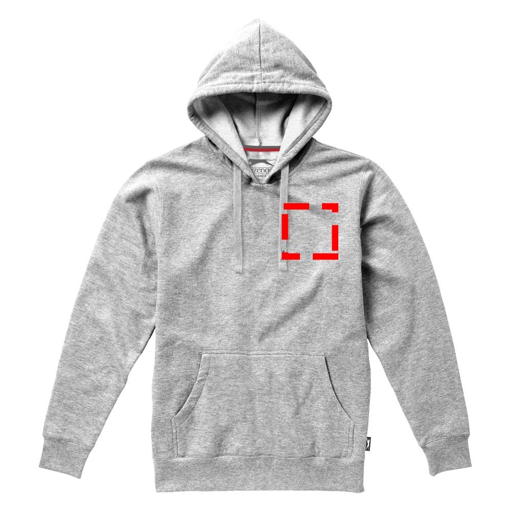 Plat gebreide rib mouw. Ribgebreide onderzijde. Trekkoord in capuchon. Kangoeroezak. Halve maan. Twee kleuren nektape. Gegraveerde zilveren oogjes. Label in zijnaad. Transfer maatlabel voor extra comfort.