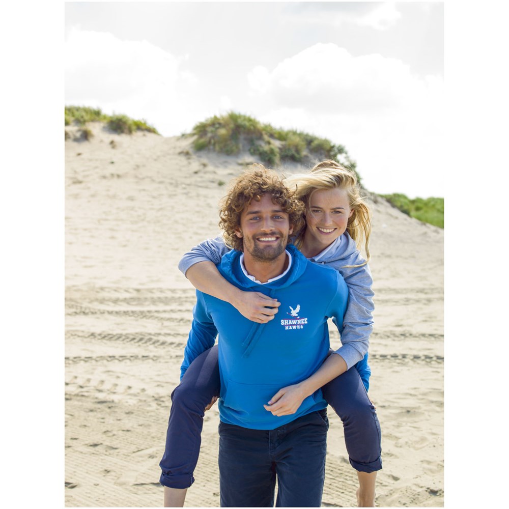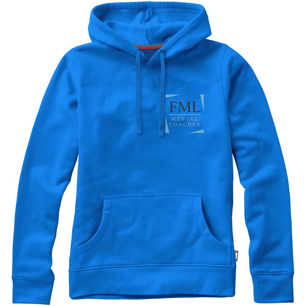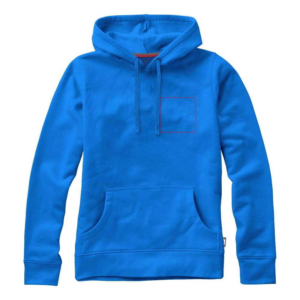 Plat gebreide rib mouw. Ribgebreide onderzijde. Trekkoord in capuchon. Kangoeroezak. Toelopende taille voor een meer flatterende pasvorm. Halve maan. Twee kleuren nektape. Gegraveerde zilveren oogjes. Label in zijnaad. Transfer maatlabel voor extra comfort.