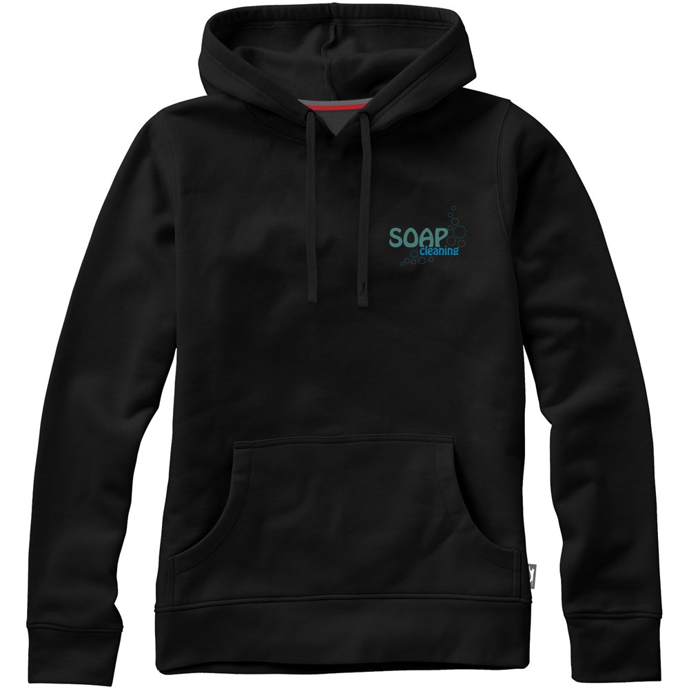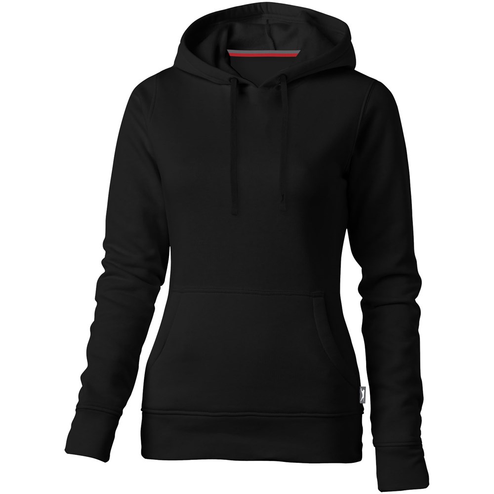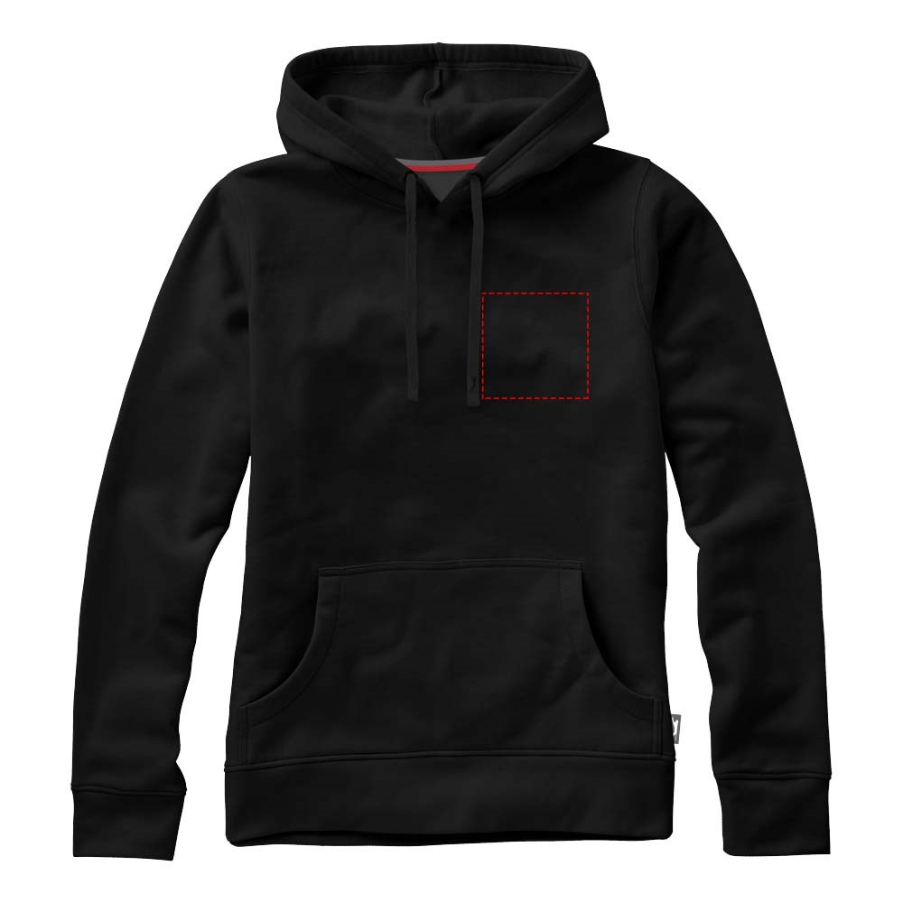 Plat gebreide rib mouw. Ribgebreide onderzijde. Trekkoord in capuchon. Kangoeroezak. Toelopende taille voor een meer flatterende pasvorm. Halve maan. Twee kleuren nektape. Gegraveerde zilveren oogjes. Label in zijnaad. Transfer maatlabel voor extra comfort.