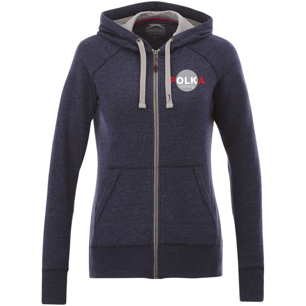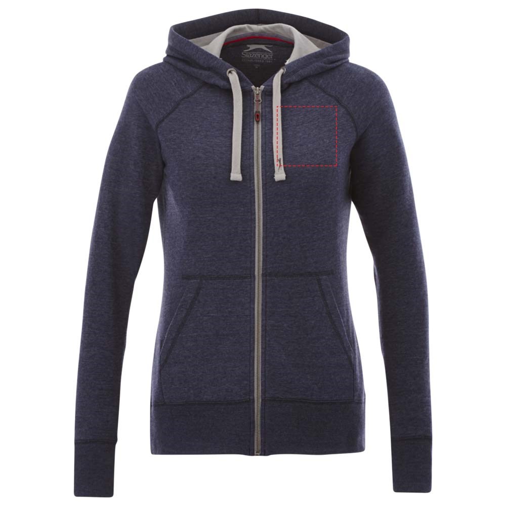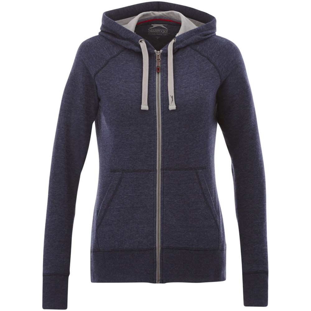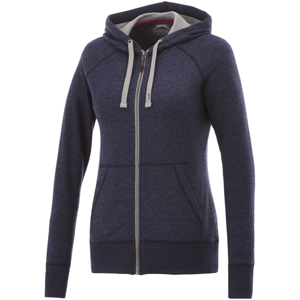 Contrast gekleurd single jersey voering. Interne media zak. Duimsgaten. Trekkoord in capuchon. Kangoeroezak. Contrast gekleurde flatlock stiksels. Ribgebreide onderzijde. Plat gebreide rib mouw. Metalen rits midden voorsluiting. Twee kleuren nektape.