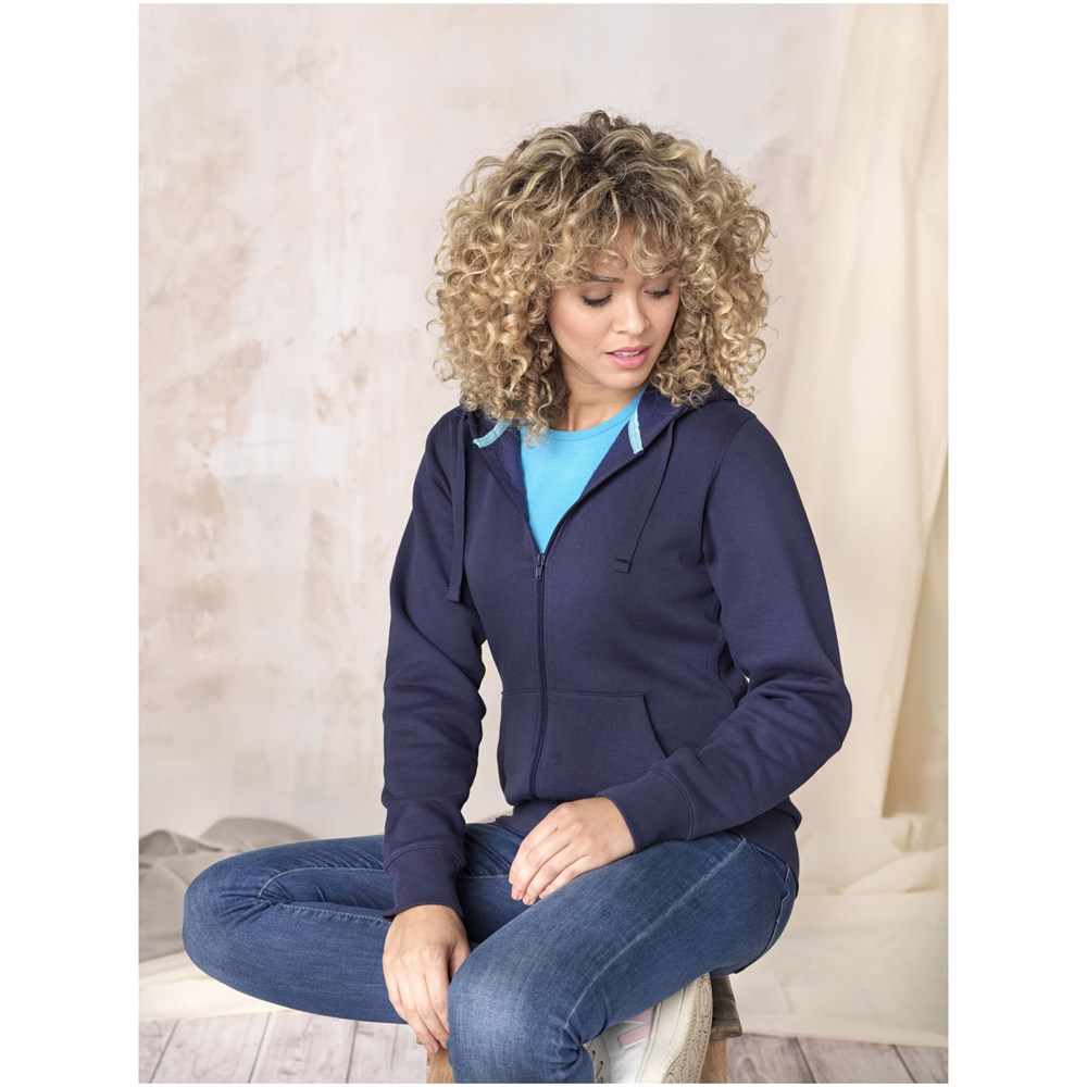 Duurzame promotionele kleding. GRS-gecertificeerde spiraalrits centraal vóór. GOTS gecertificeerd trekkoord in capuchon. Toelopende taille voor een meer flatterende pasvorm. Kangoeroezak. Geborsteld aan de binnenkant. Vlakgebreide ribmouwen. Vlakgebreide geribde onderzijde. Tweekleurige merk nektape. Halve maan. Transfer maatlabel voor extra comfort.