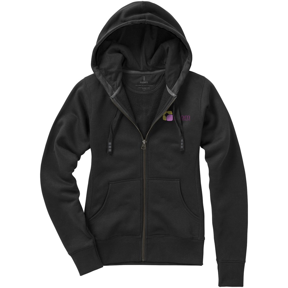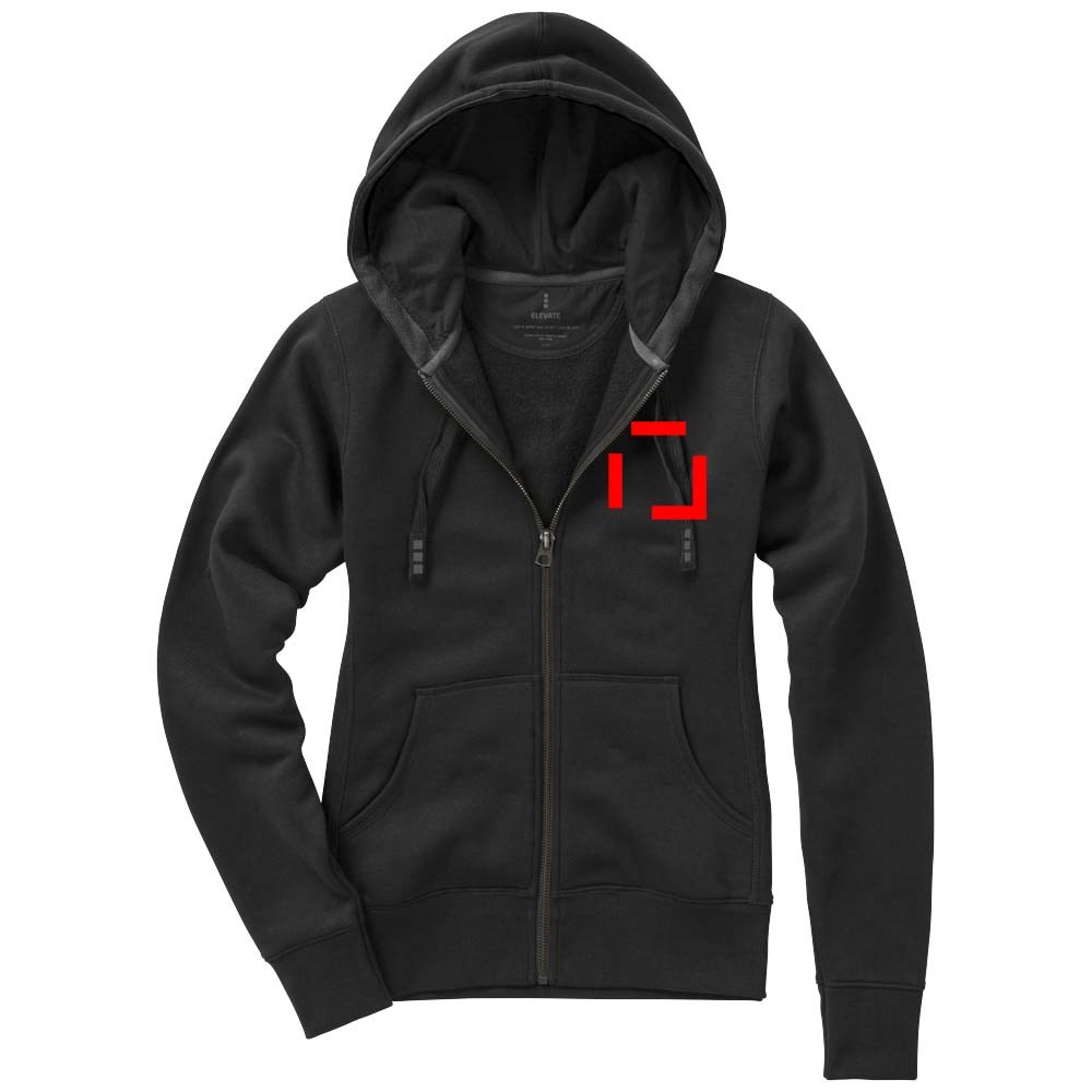 Ribgebreide zijpanelen. Plat gebreide rib mouw. Ribgebreide onderzijde. Trekkoord in capuchon. Kangoeroezak. Halve maan. Single jersey voering aan binnenkant capuchon. Gegraveerde zilveren oogjes. Satijnen nektape. contrast gekleurde visgraat tape.