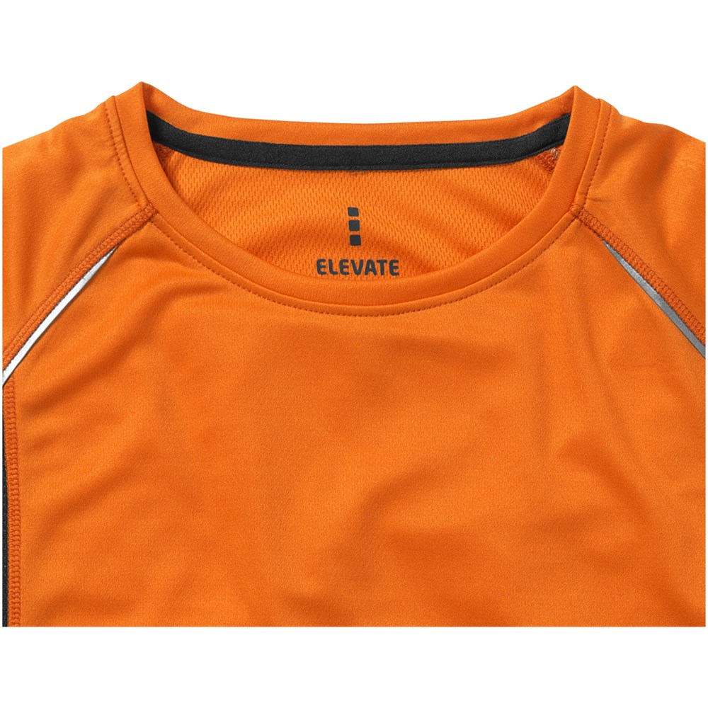 Boord in dezelfde stof. Ronde hals. Zijpanelen in mesh stof. Reflecterende details. Raglan mouwen. Transfer maatlabel voor extra comfort. Smallere details in flatlock steken. Satijnen nektape.
