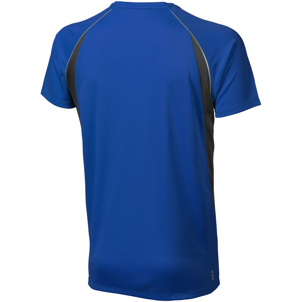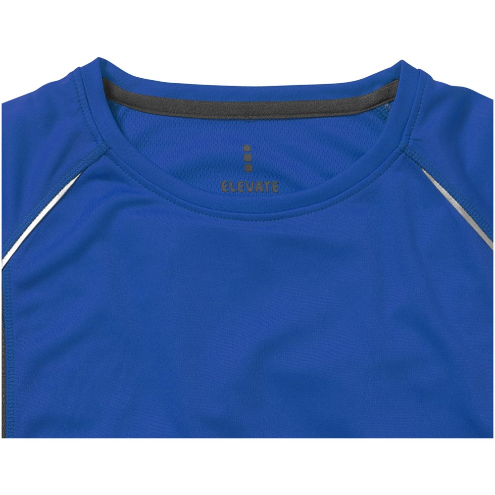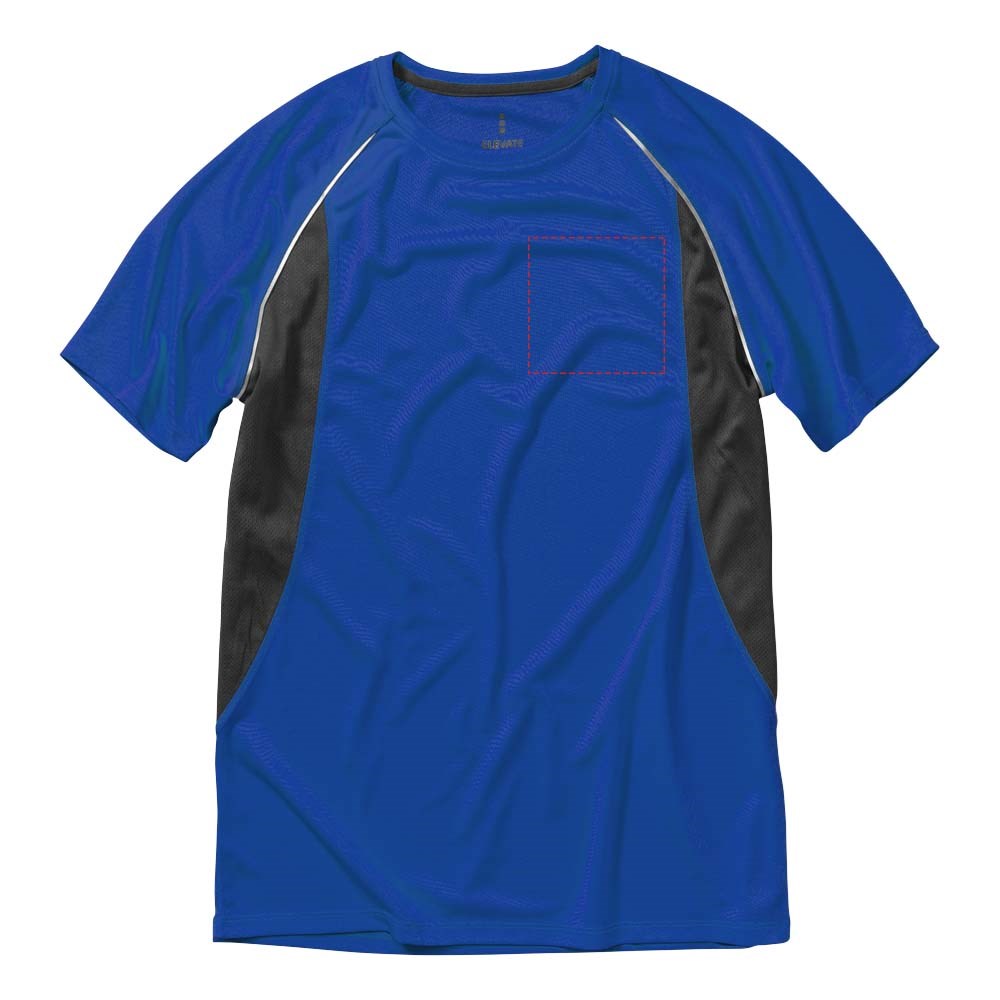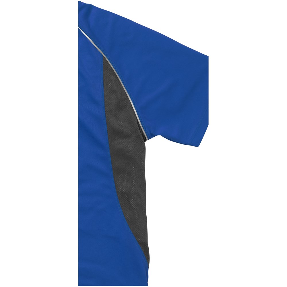 Boord in dezelfde stof. Ronde hals. Zijpanelen in mesh stof. Reflecterende details. Raglan mouwen. Transfer maatlabel voor extra comfort. Smallere details in flatlock steken. Satijnen nektape.