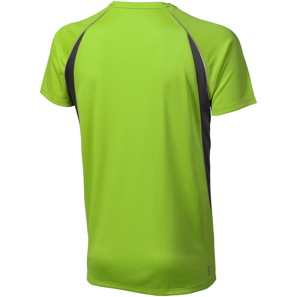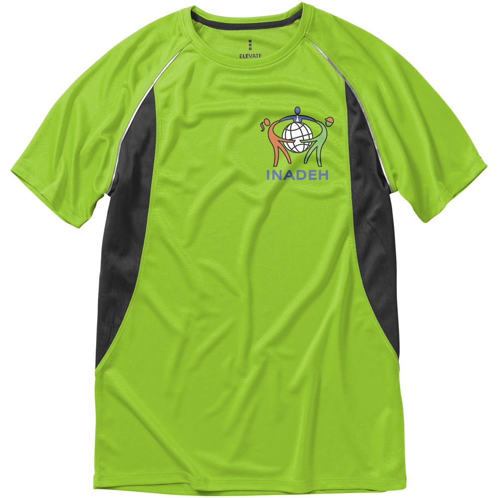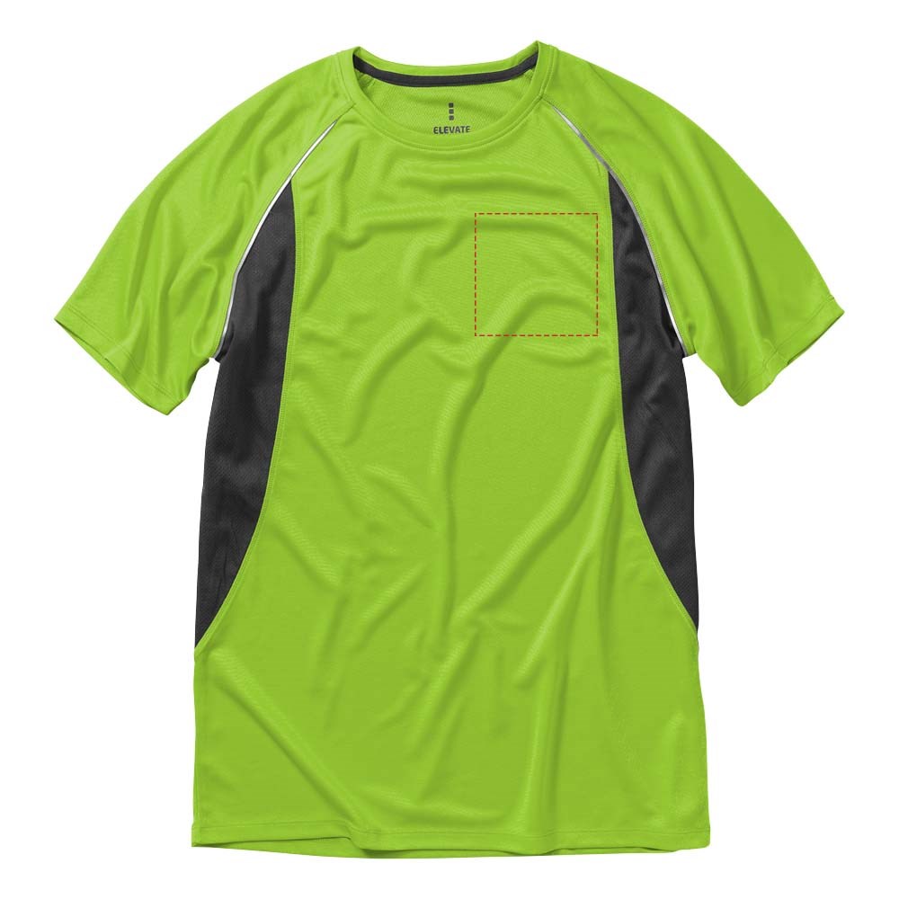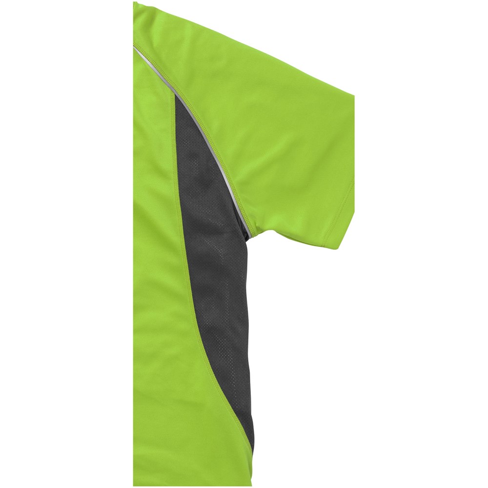 Boord in dezelfde stof. Ronde hals. Zijpanelen in mesh stof. Reflecterende details. Raglan mouwen. Transfer maatlabel voor extra comfort. Smallere details in flatlock steken. Satijnen nektape.