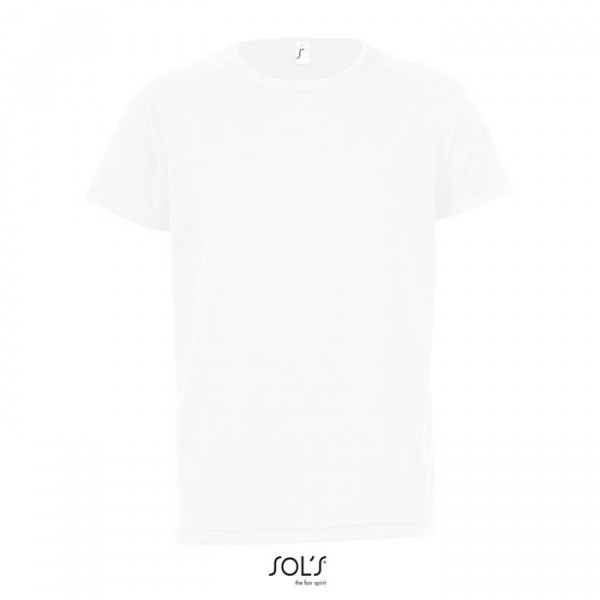 SOL'S SPORTY Kinder t-shirt 140g/m². Het ademende materiaal en de snit met raglanmouwen en flatlock-stiksels maken dit product ideaal voor al je sportactiviteiten. Ook in neontint. 100% polyester met ademend effect - droge pasvorm. Raglan mouwen. Langere rug.