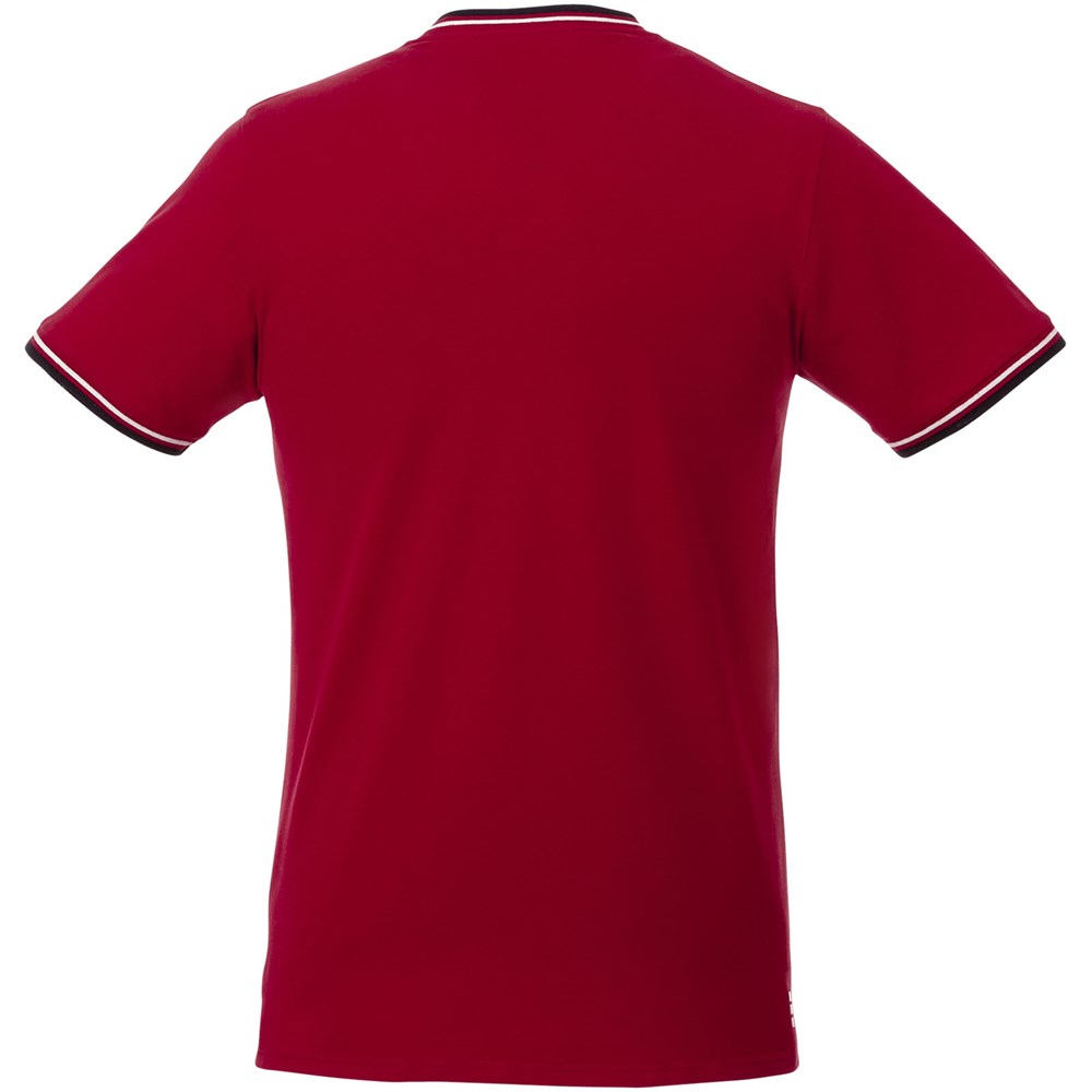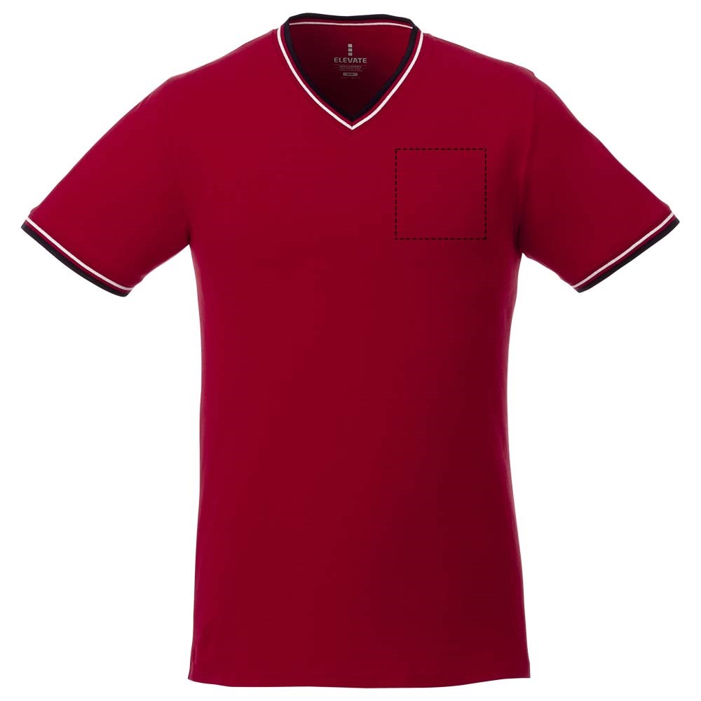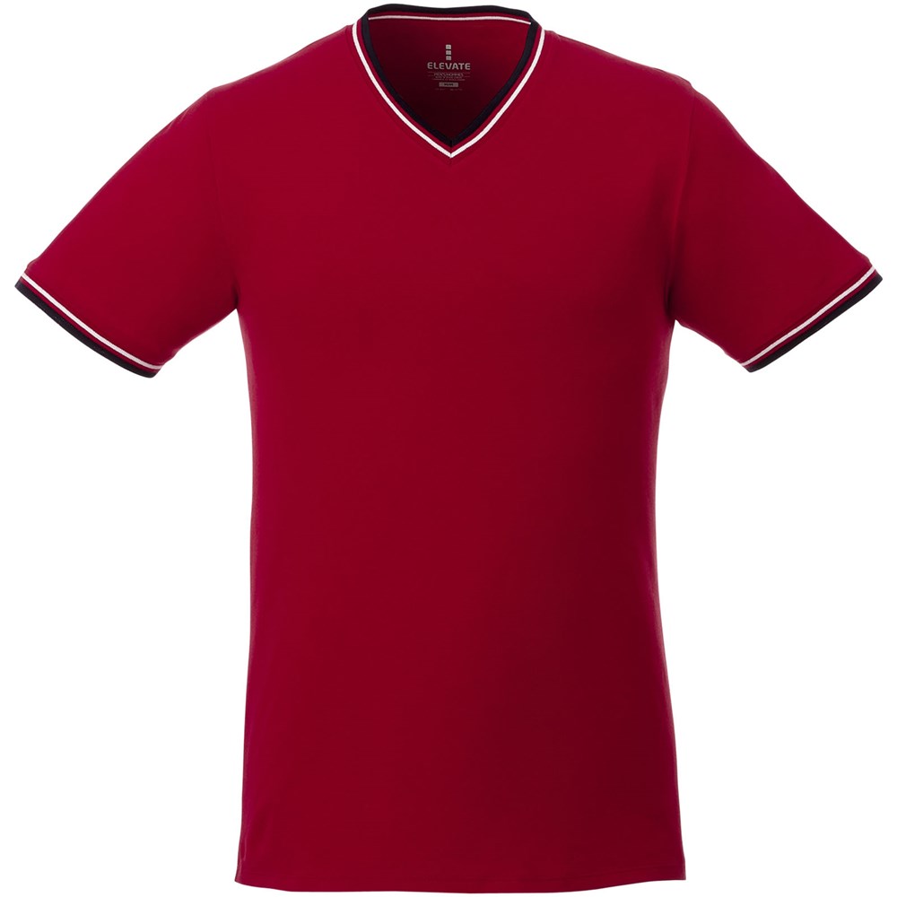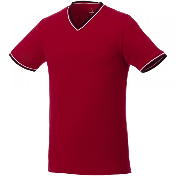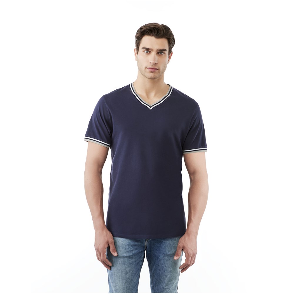 Vlakgebreide kraag. Plat gebreide rib mouw. Contrast gekleurde tipping op de kraag en mouwen. V-hals. Dubbele stiksels. Transfer maatlabel voor extra comfort.