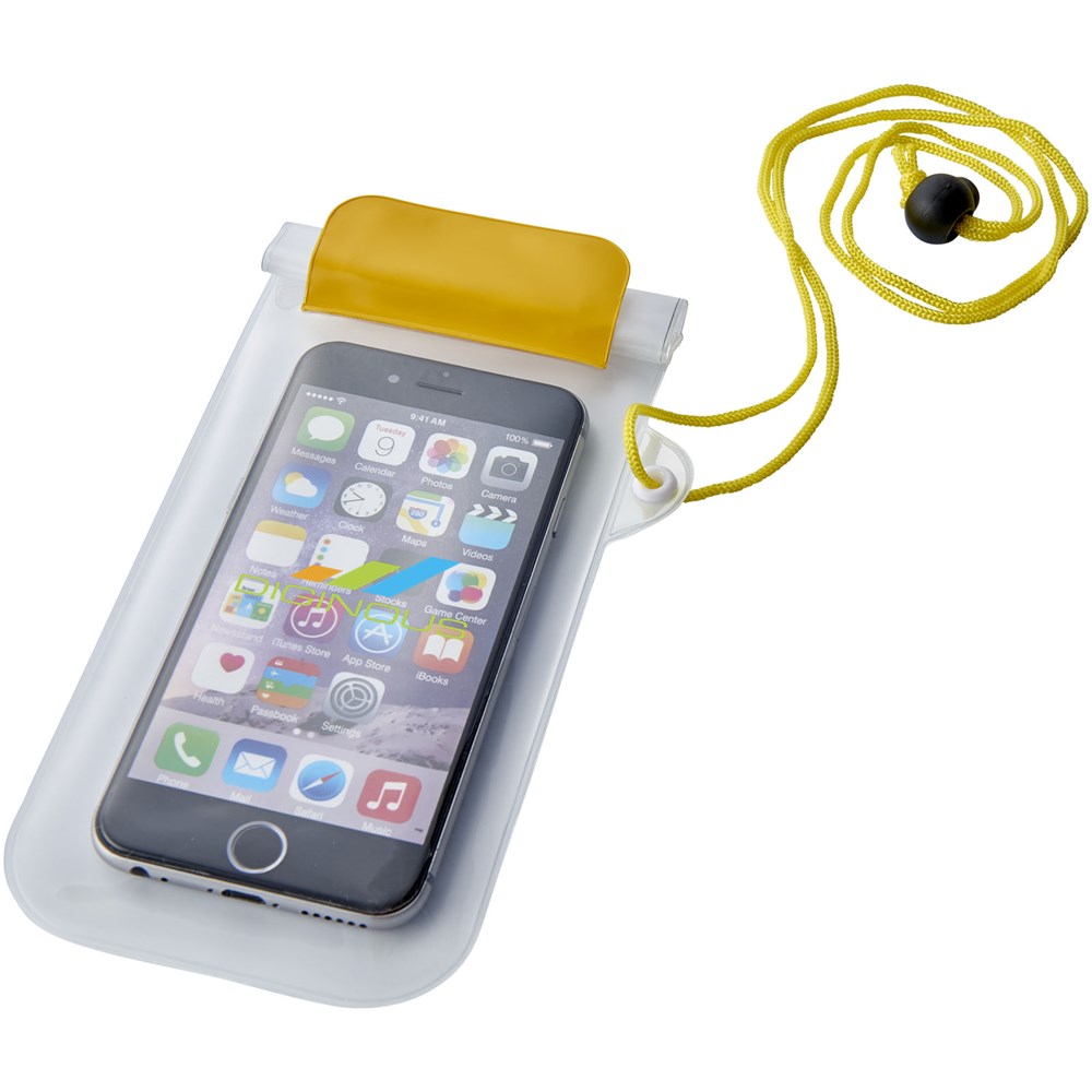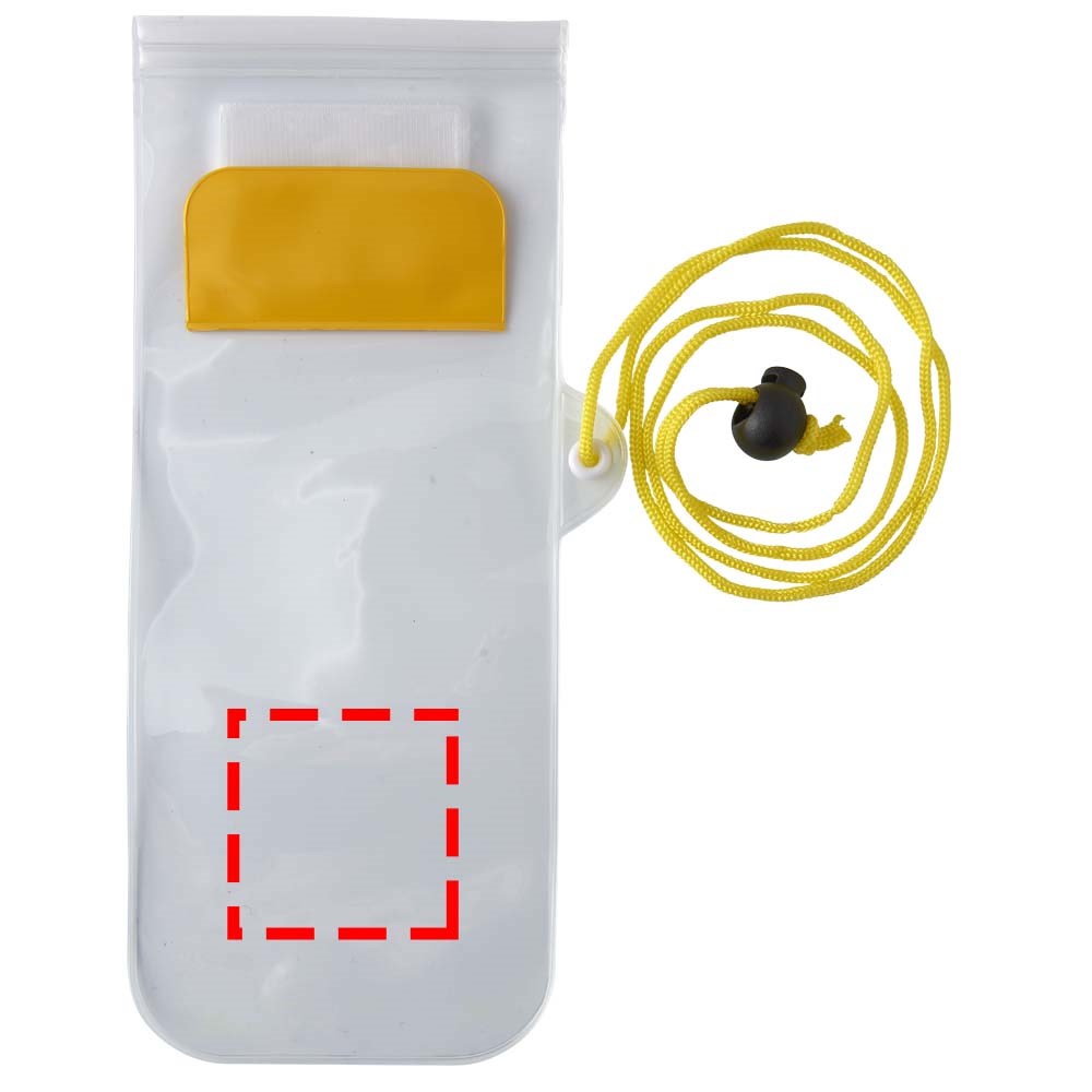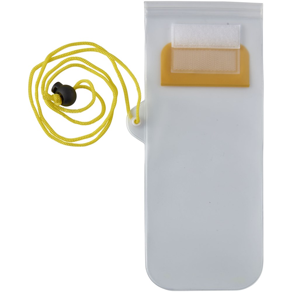 Opbergtas met matte witte achterzijde transparant, doorzichtig touch scherm met ritssluiting en gekleurde flap met klittenbandsluiting. Inclusief nekkoord met trekkoord sluiting.
