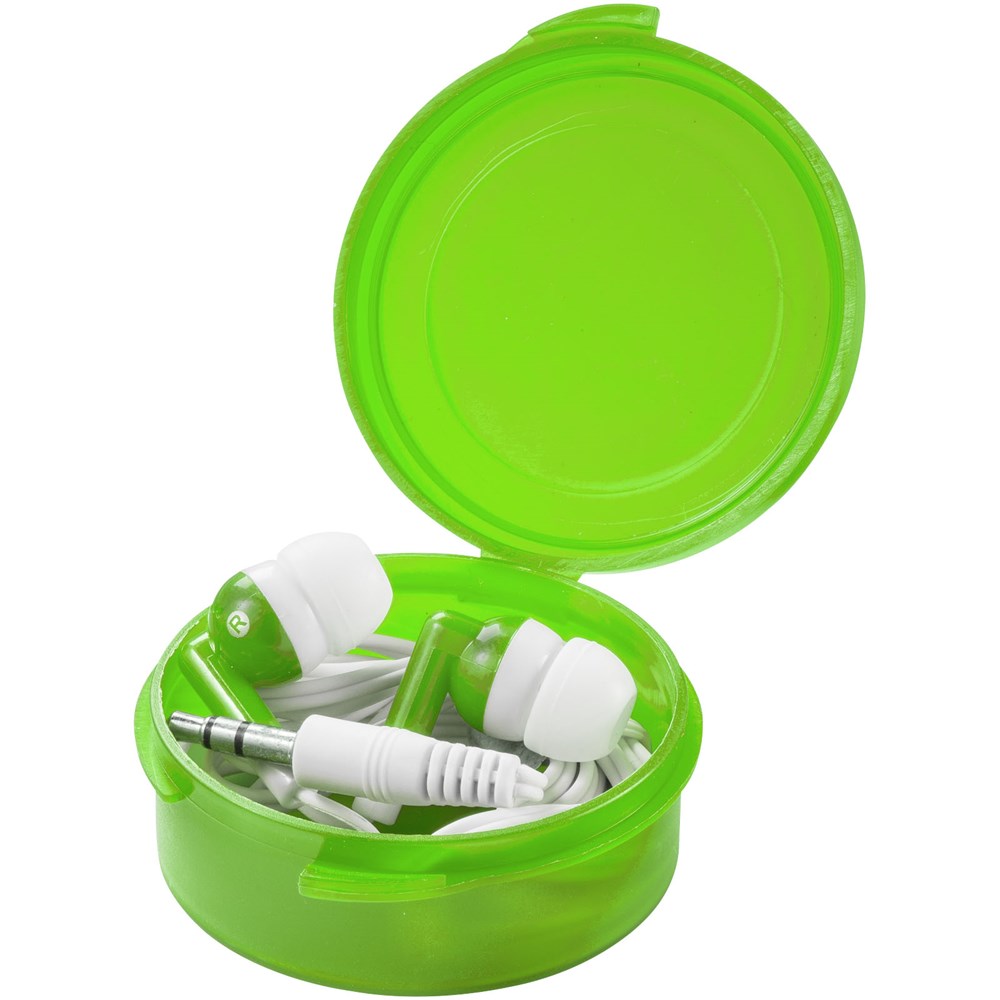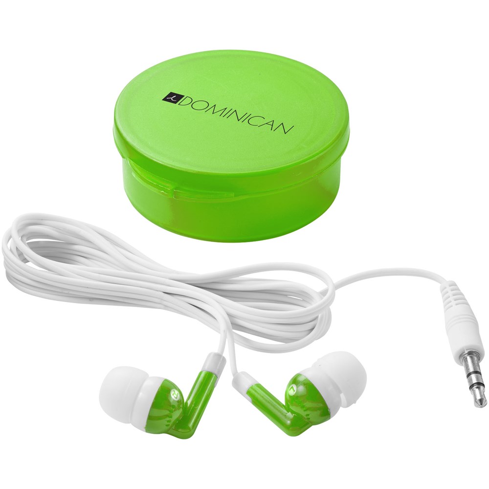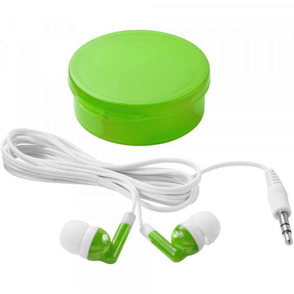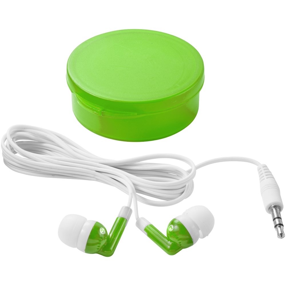 Geschikt voor alle standaard audioapparaten. Oordopjes in herbruikbare ronde cassette. Met 3,5 mm audiostekker en 120 cm oortelefoonsnoer.