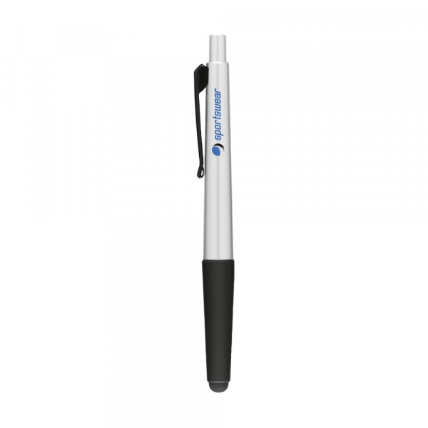 Blauwschrijvende metallic look balpen met gripvast voorstuk, drukknop en rubberen top/pointer voor het bedienen van touchscreens (zoals iPhone/iPad).