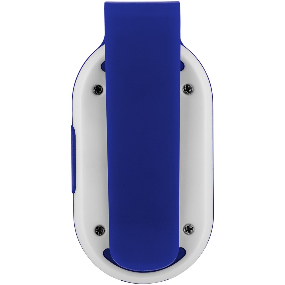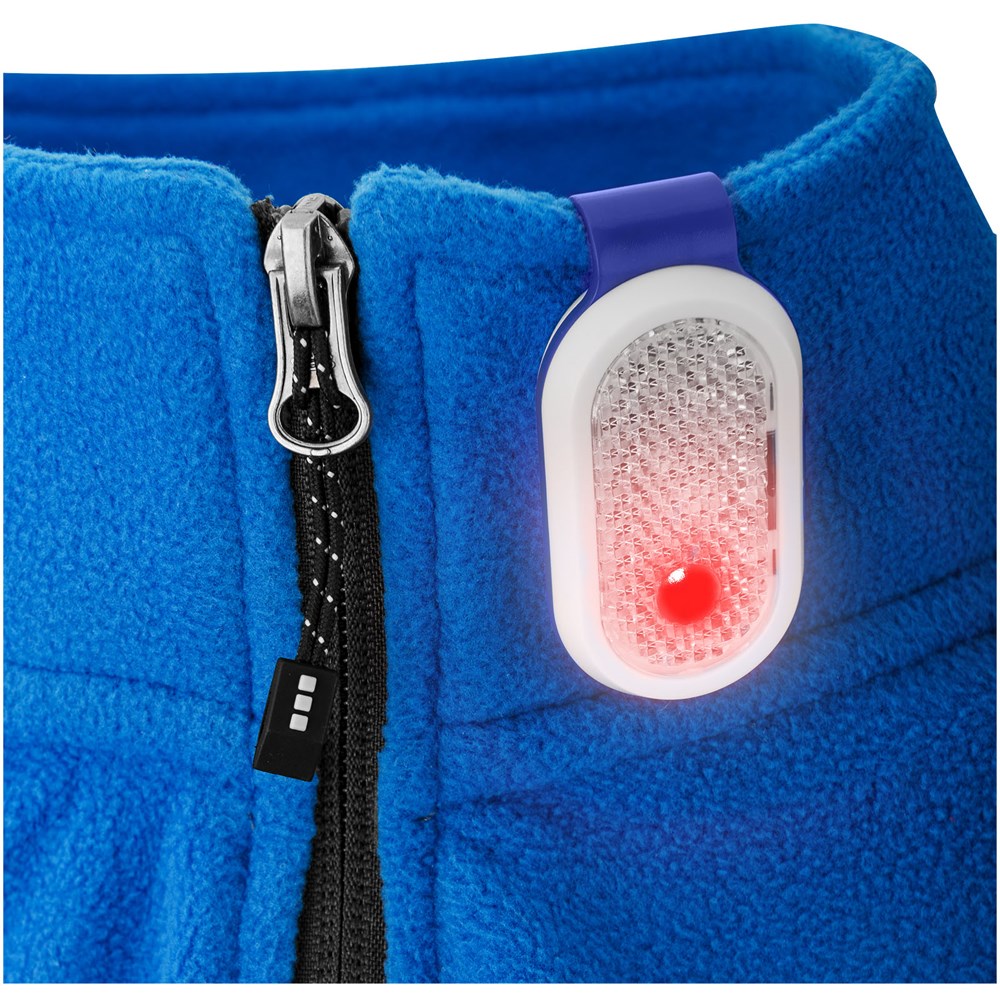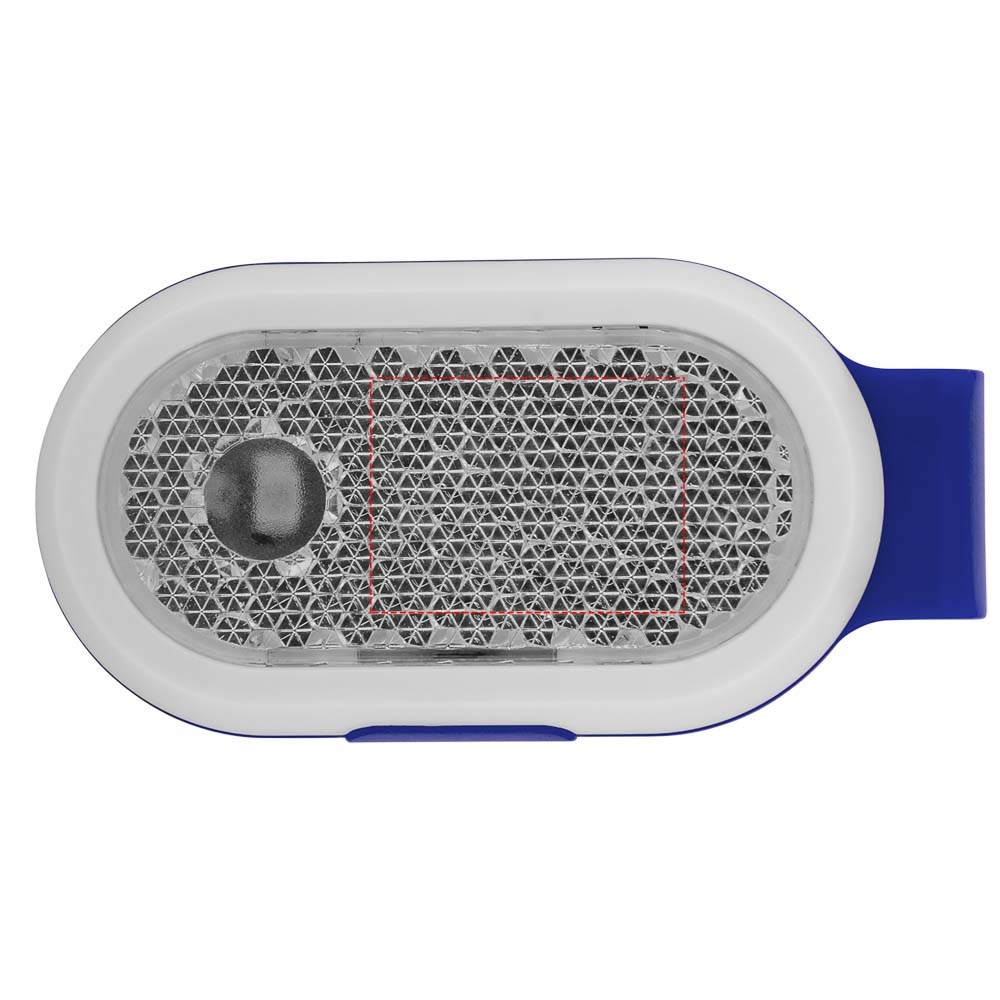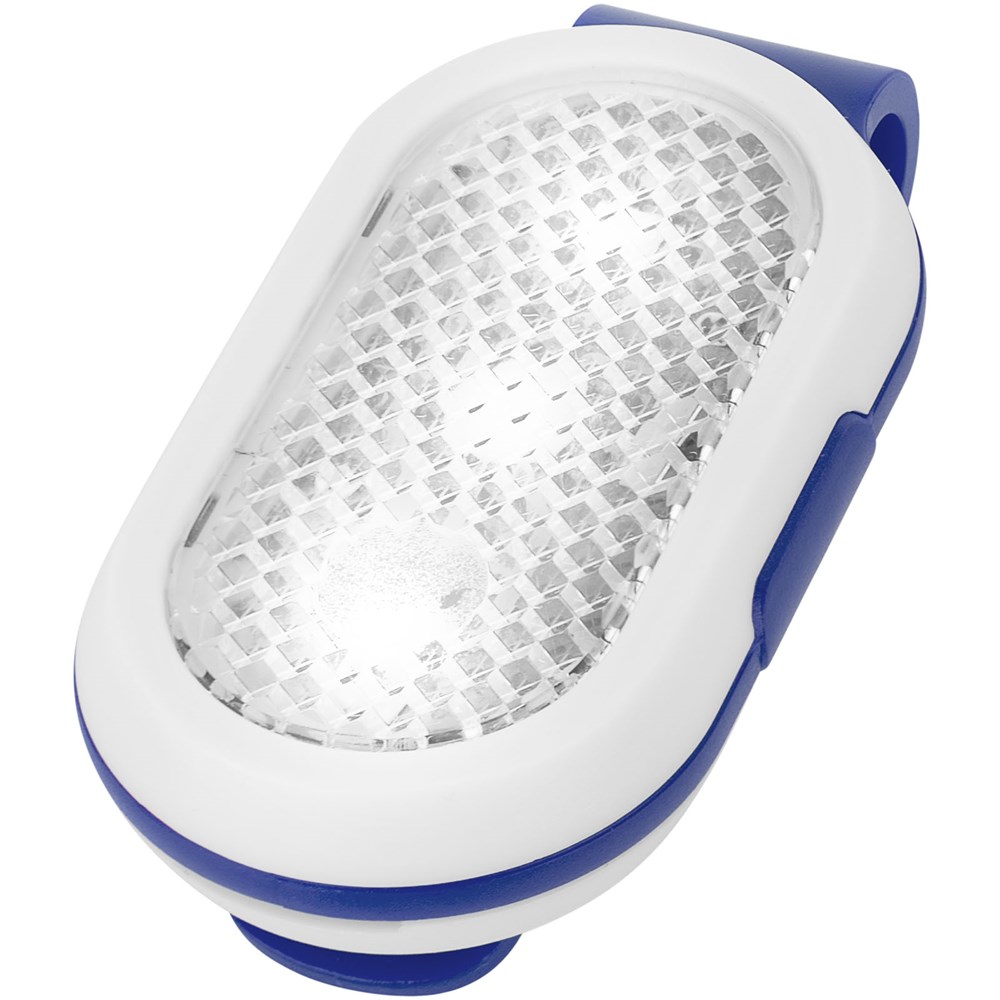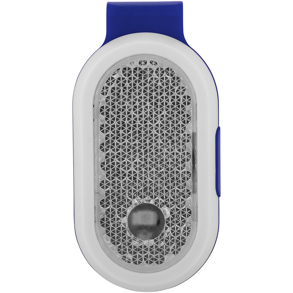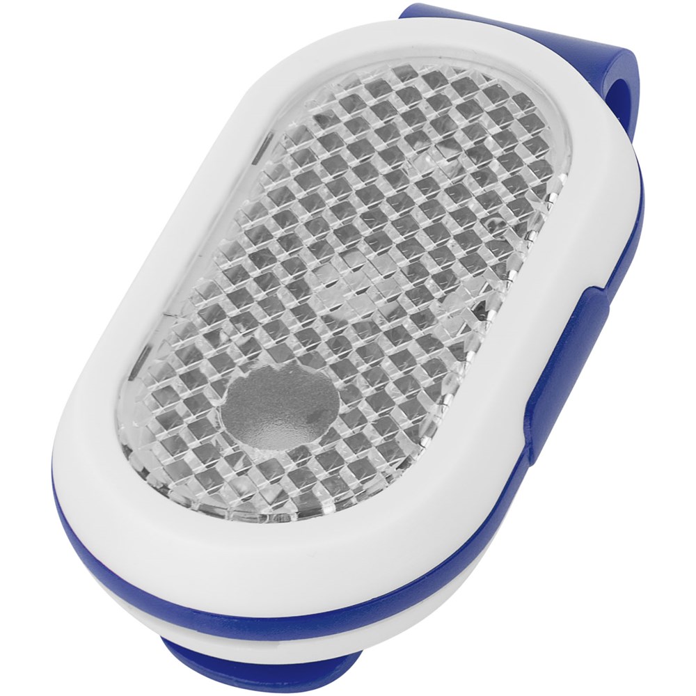 Reflector lampje met gekleurde clip achteraan. Twee lichtstanden, continu of knipperend. aan/uit knop aan de zijkant. Inclusief batterijen.