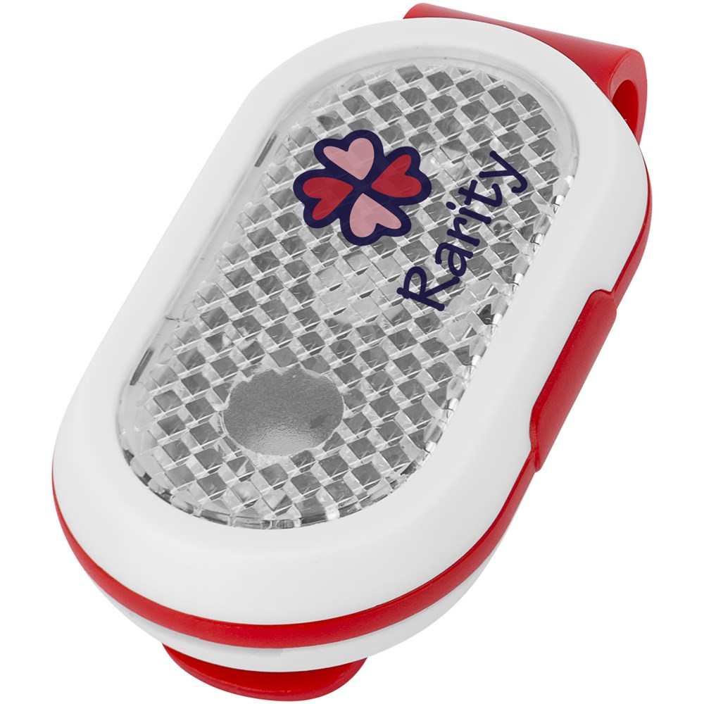 Reflector lampje met gekleurde clip achteraan. Twee lichtstanden, continu of knipperend. aan/uit knop aan de zijkant. Inclusief batterijen.
