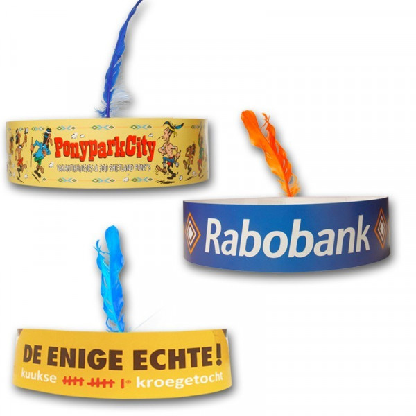 Indianerstirnbänder aus Karton mit Naturfeder. Flachliegend plano im Karton wobei die Kauffgröße der Indianerstirnbänder durch einen einfachen variabelen Rückseitenverschluss einstellen lässt.