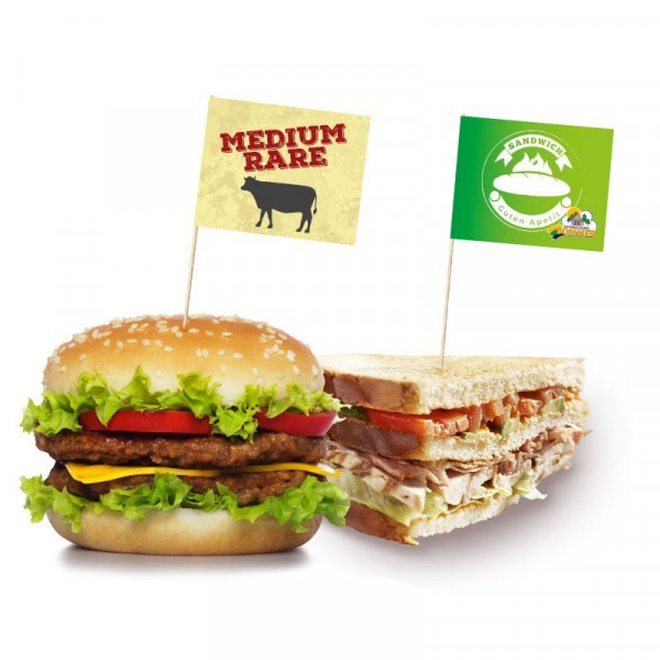 Hamburgerprikkers-Sandwichprikkers digitaal geprint, standaard hygiënisch verpakt, kleine oplages mehr