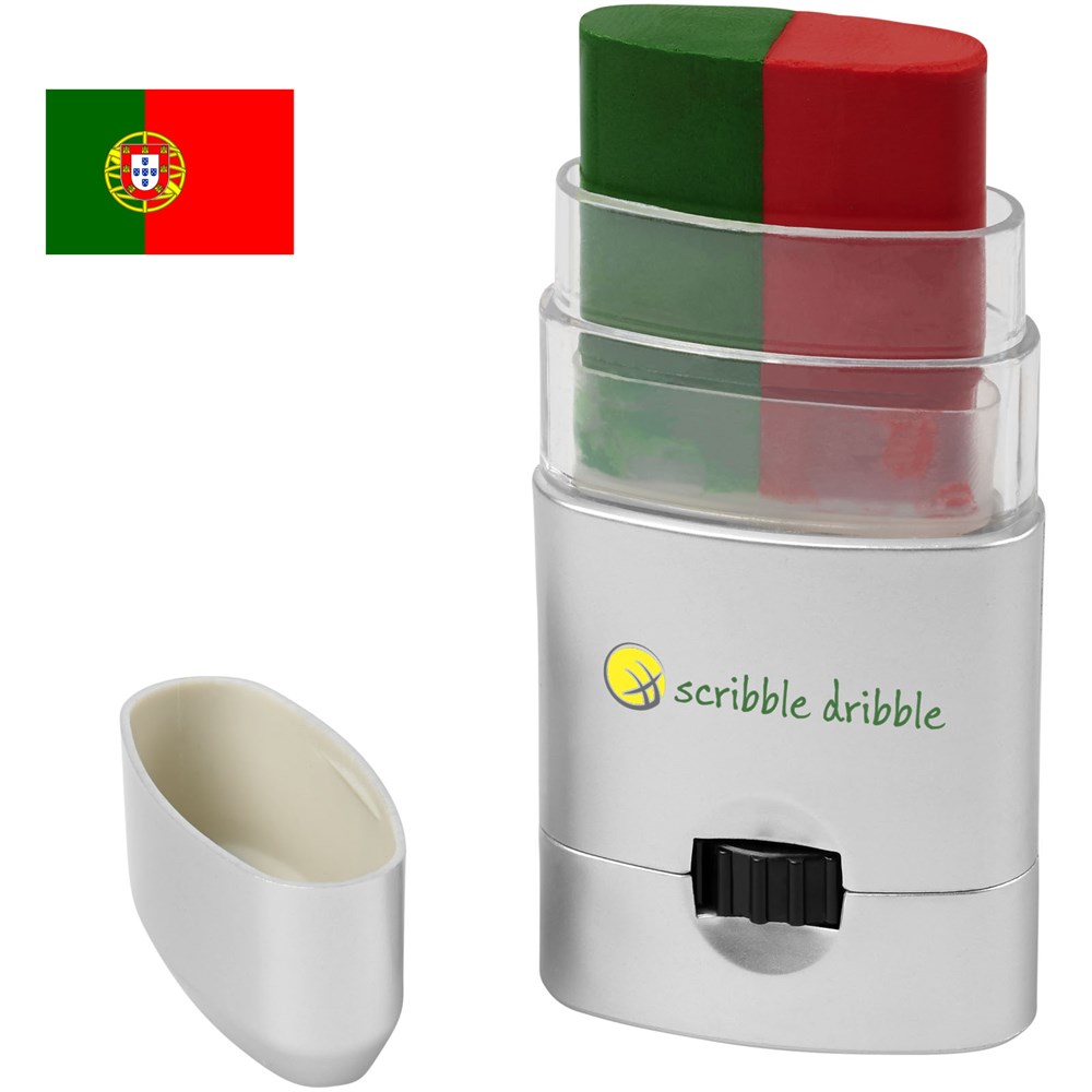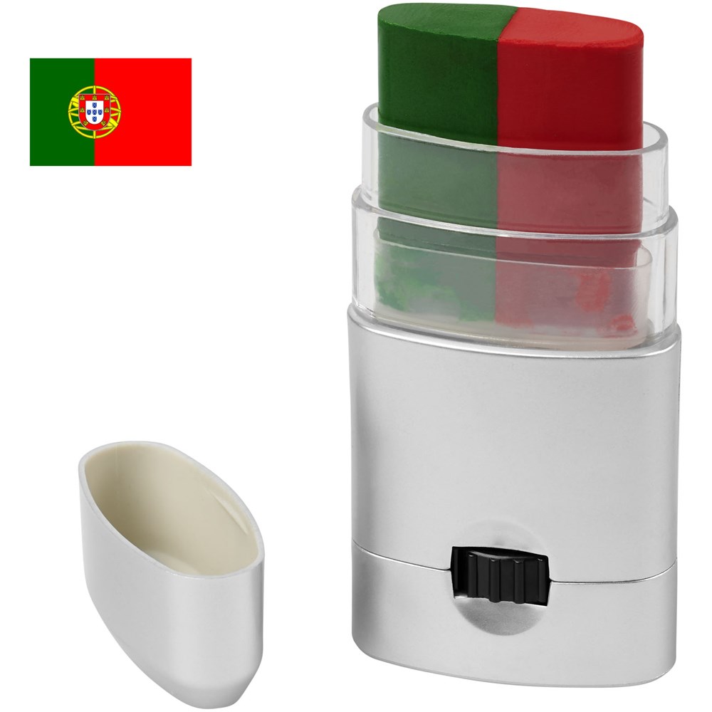 Gemakkelijk te reinigen bodypaint beschikbaar in een breed scala aan kleurencombinaties die de vlaggen van Frankrijk, Duitsland, Italië, Nederland, België, Portugal, Spanje, Oostenrijk, Denemarken, Zwitserland, Zweden en Polen vertegenwoordigen. Kan ook op het gezicht worden aangebracht en kan worden verwijderd met make-upreiniger of met water en zeep. Geproduceerd volgens GMP (Good Manufacturing Practices) nalevingsvereisten en voldoet aan de EU-regelgeving voor cosmetische producten (Verordening (EG) nr. 1223/2009). CPNP registratienummer 3260279.