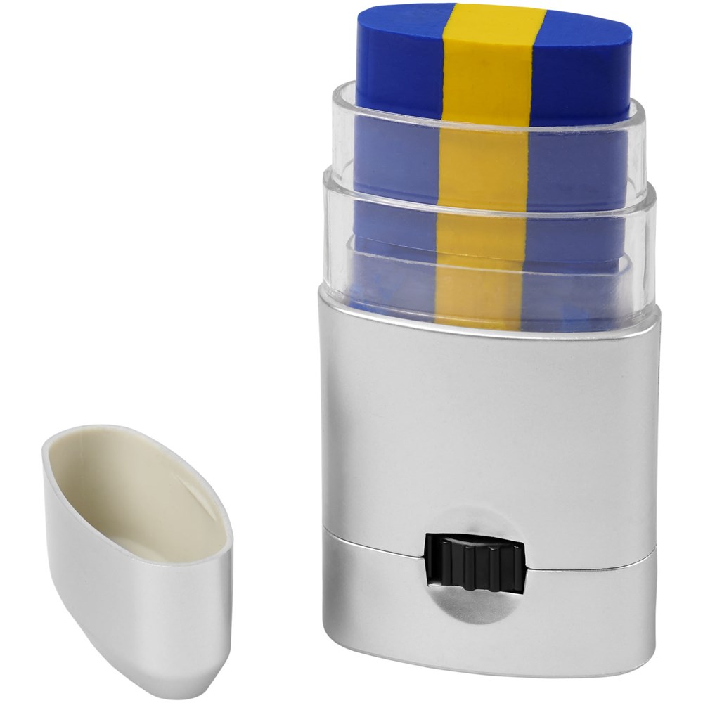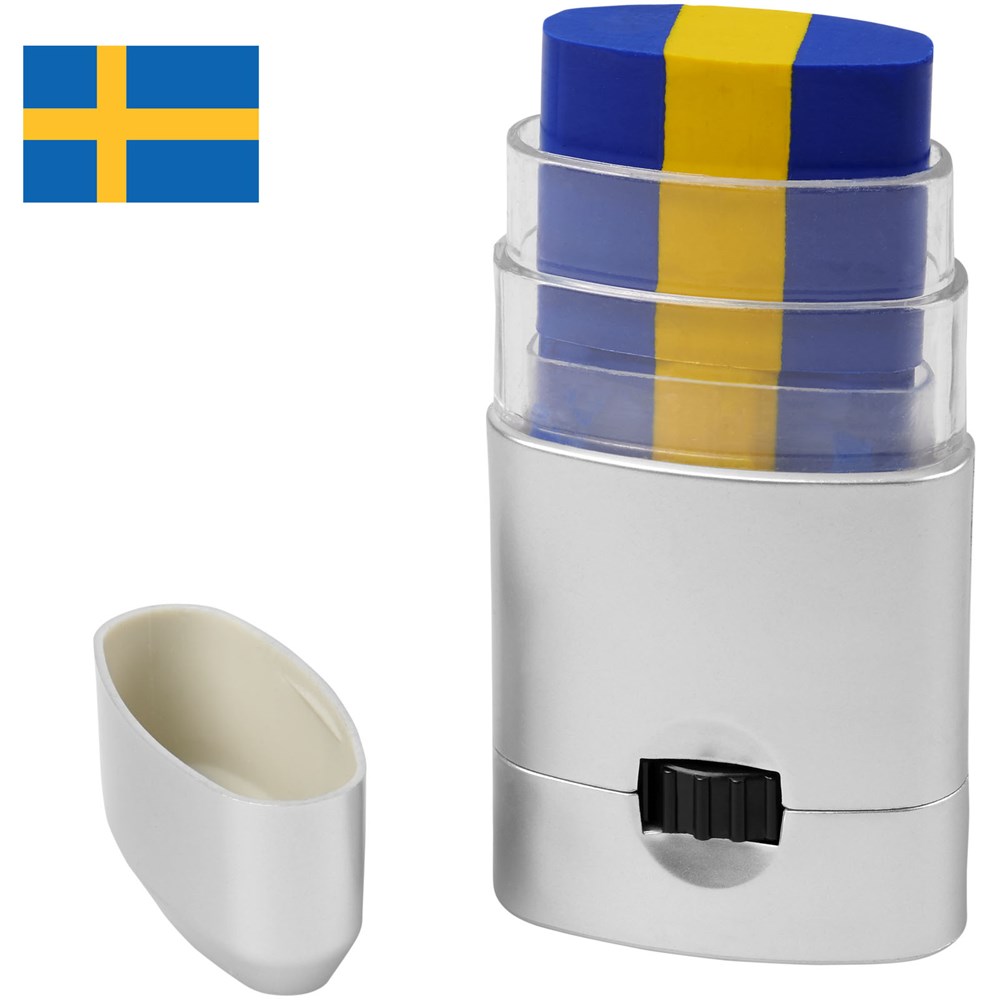 Gemakkelijk te reinigen bodypaint beschikbaar in een breed scala aan kleurencombinaties die de vlaggen van Frankrijk, Duitsland, Italië, Nederland, België, Portugal, Spanje, Oostenrijk, Denemarken, Zwitserland, Zweden en Polen vertegenwoordigen. Kan ook op het gezicht worden aangebracht en kan worden verwijderd met make-upreiniger of met water en zeep. Geproduceerd volgens GMP (Good Manufacturing Practices) nalevingsvereisten en voldoet aan de EU-regelgeving voor cosmetische producten (Verordening (EG) nr. 1223/2009). CPNP registratienummer 3260279.