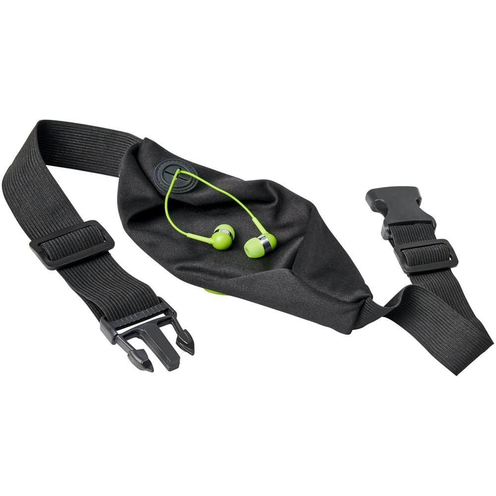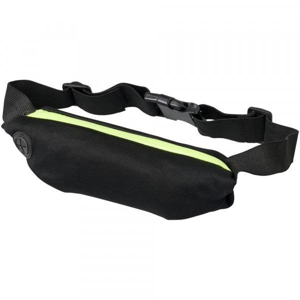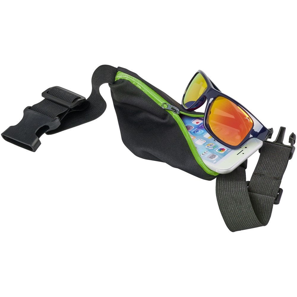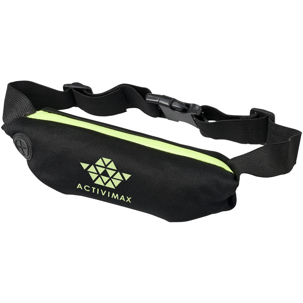 Flexibele sportheuptas met gekleurde rits en oordopjesuitgang. Het spandex materiaal en de elastische heupband met gespsluiting zorgen voor flexibiliteit tijdens het trainen of andere buitenactiviteiten. Groot decoratievlak aan de voorkant.